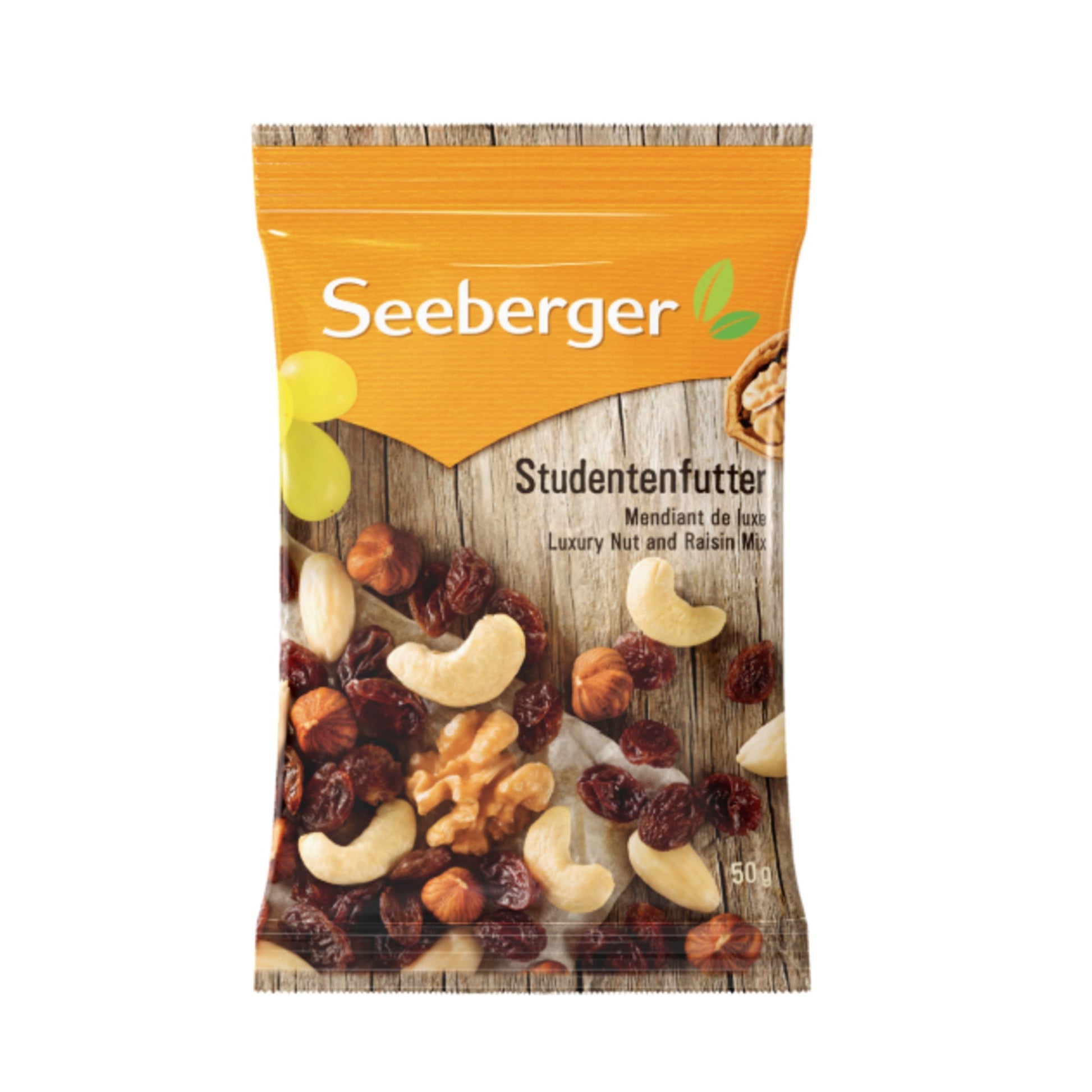 Bezeichnung: SEEBERGER Studentenfutter Haselnüsse, Mandeln (blanchiert), Cashewkerne, Weinbeeren 50 g/Pack.