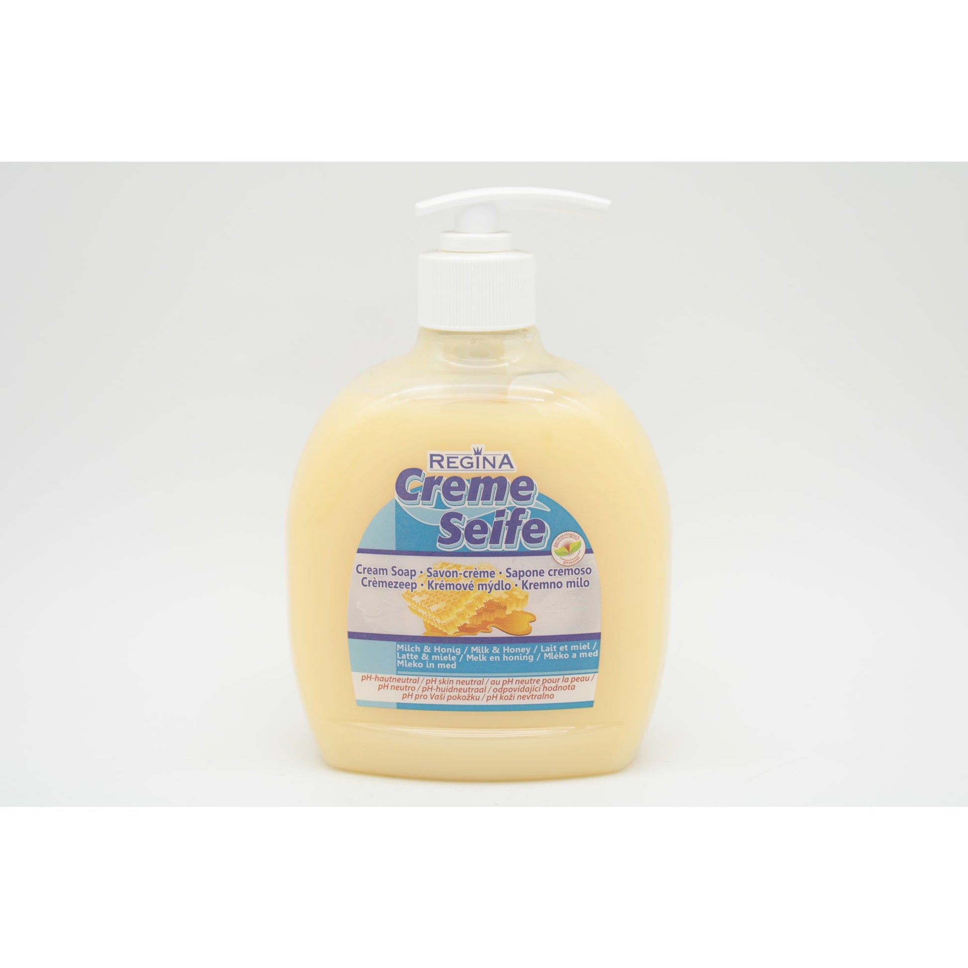 Bezeichnung: Regina Flüssigseife Honig-Milch Ausführung des Behälters: Pumpflasche Material des Behälters: Kunststoff 0,5l