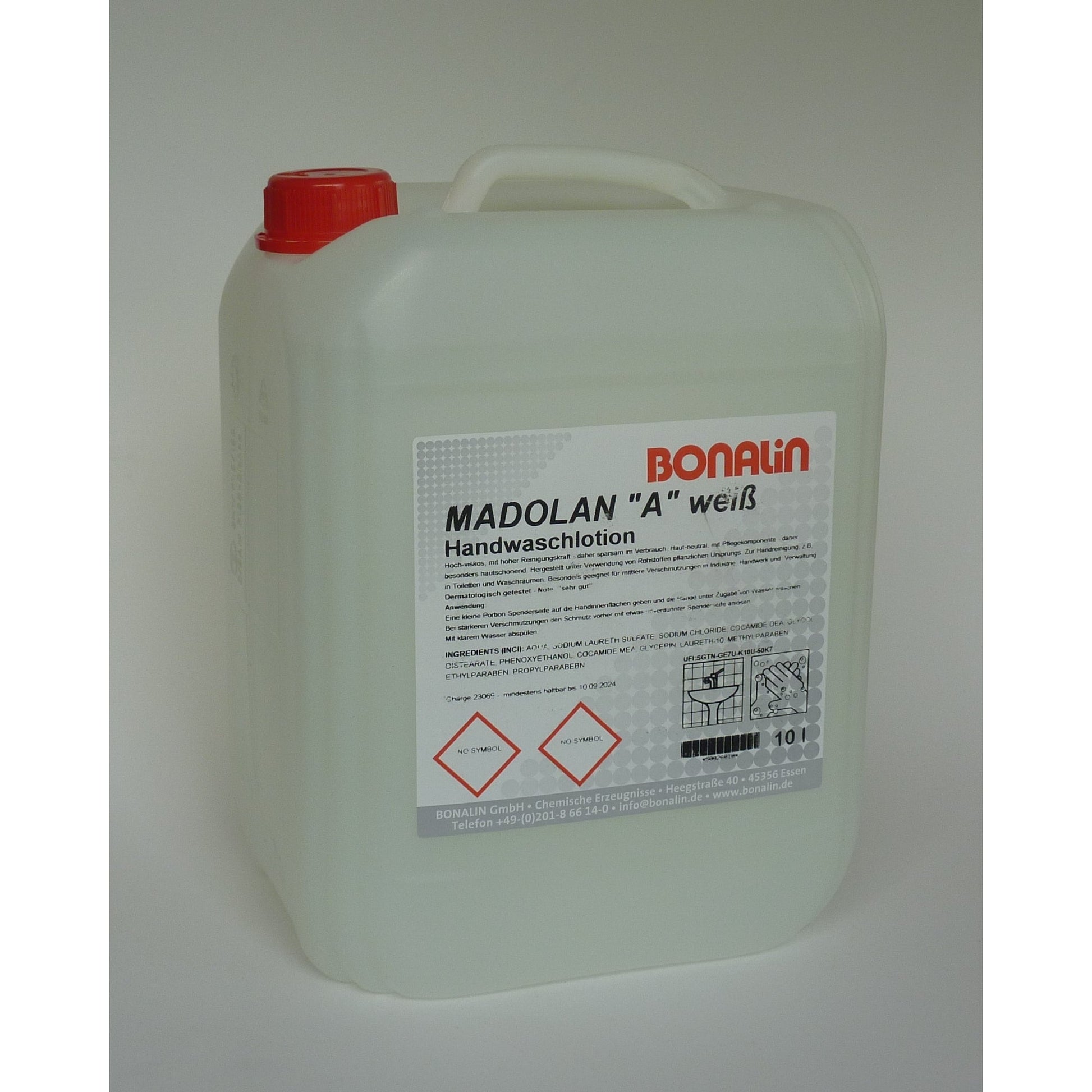 Bezeichnung: BONALIN Flüssigseife Madolan B dermatologisch getestet antibakteriell pH-Wert: 5,5 Ausführung des Behälters: Kanister Material des Behälters: Kunststoff 5l