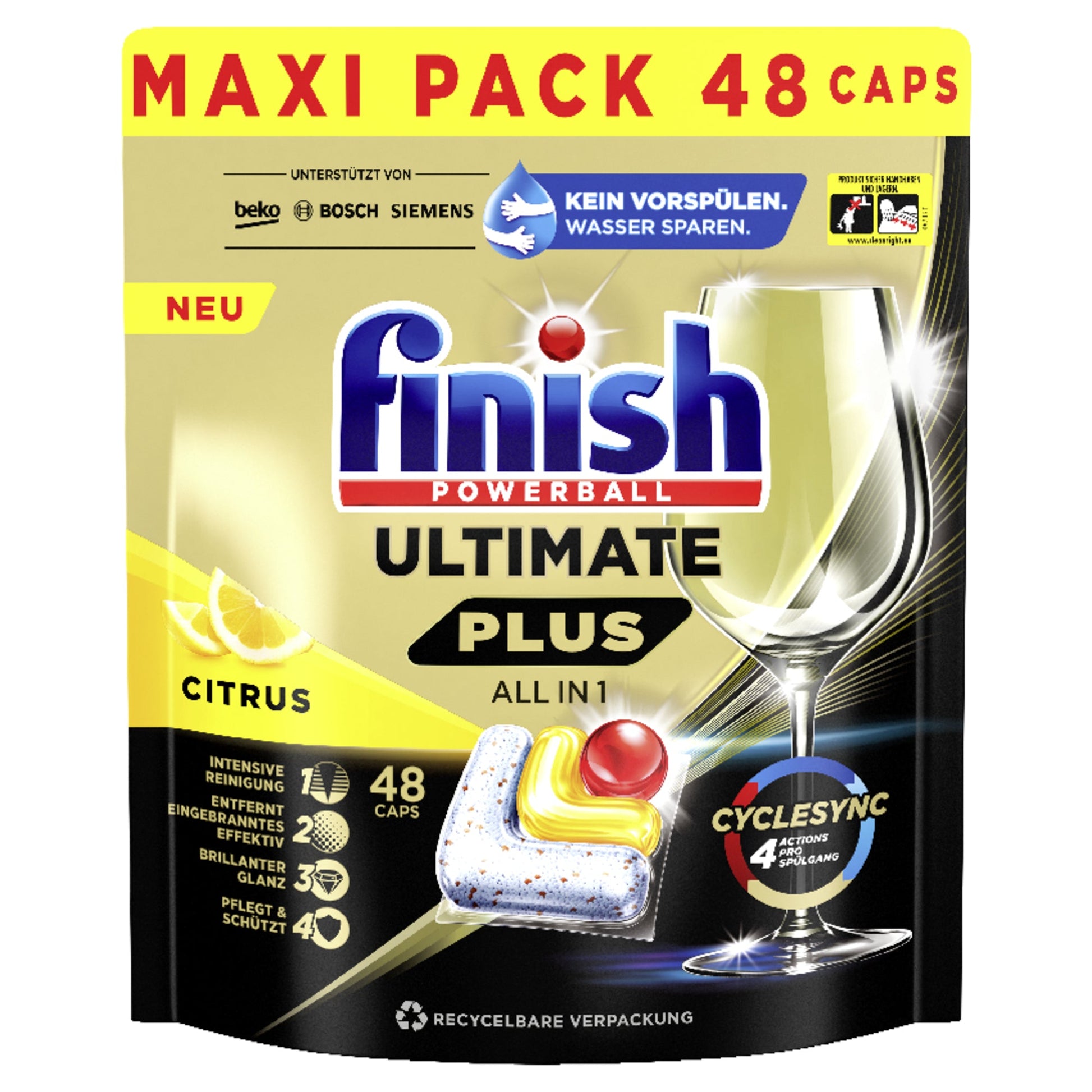 Der neue Finish Ultimate Plus All in 1 Cap sorgt für eine intensive Reinigung und brillanten Glanz schon beim 1. Spülgang. Seine CYCLESYNC-Technologie ermöglicht dem richtigen Inhaltsstoff* sich genau im richtigen Moment zu entfalten, sodass selbst Eingebranntes effektiv entfernt wird. Die innovative Cap-Komposition vereint 4 Funktionen miteinander und sorgt so für eine intensive Reinigung - ganz ohne Vorspülen. So sparen Sie nicht nur Zeit, sondern reduzieren auch Ihren Wasserverbrauch. Gleichzeitig schützt und pflegt der Cap Ihre Gläser, Geschirr und Besteck, wodurch der Glanz bei jedem Spülgang erhalten bleibt. Unsere Performance mit 15 % weniger Chemikaliengehalt im Vergleich zu Finish Power All in 1. Dank der innovativen Thermoforming-Technologie löst sich der Spülmaschinen-Cap schnell auf und hinterlässt in Ihrem Geschirrspüler keine Spülmittelrückstände. Das Auspacken der Caps ist zu 100 % wasserlösliche Folie nicht erforderlich. Für eine effiziente Wiederverwertung sind die Caps im praktischen, wiederverschließbaren und recycelbaren Standbodenbeutel verpackt.