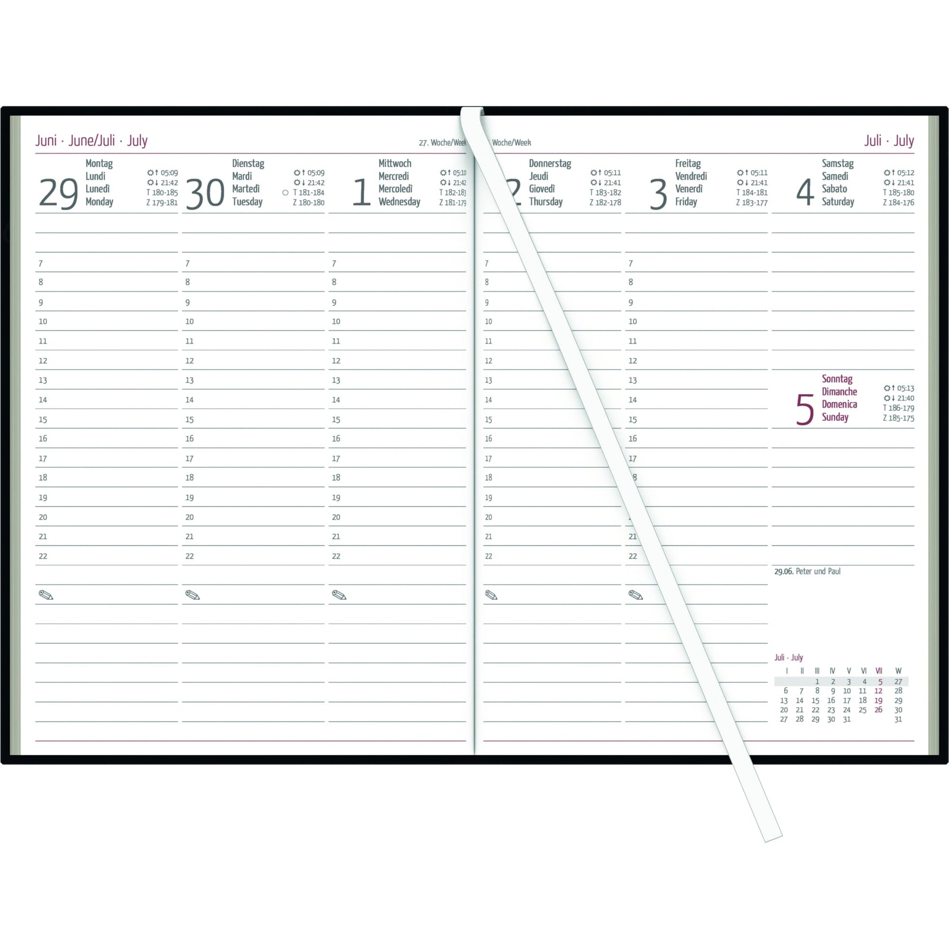 Ausführung des Inhalts (bzgl. der Hauptausstattungsteile): Sonnenzeiten, 7- Wochenübersicht