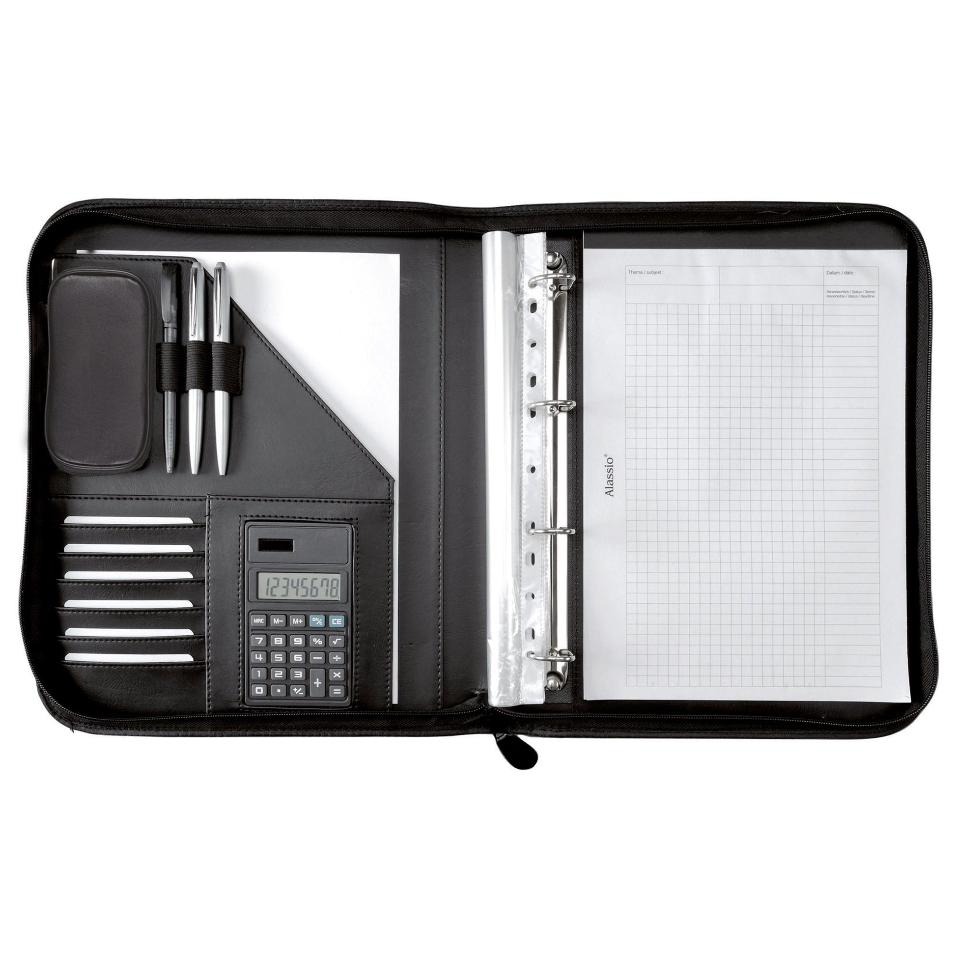 Ausführung des Inhalts (bzgl. der Hauptausstattungsteile): Universaletui, sechs Visitenkartenfächer, herausnehmbare Ringmechanik, verschließbares Einschubfach außen, A4 Einschubfach