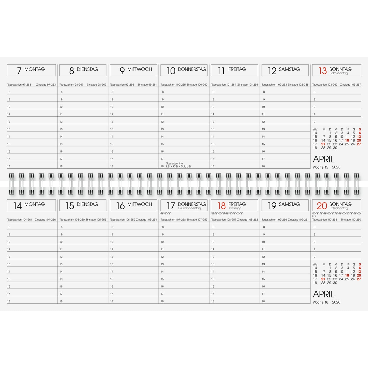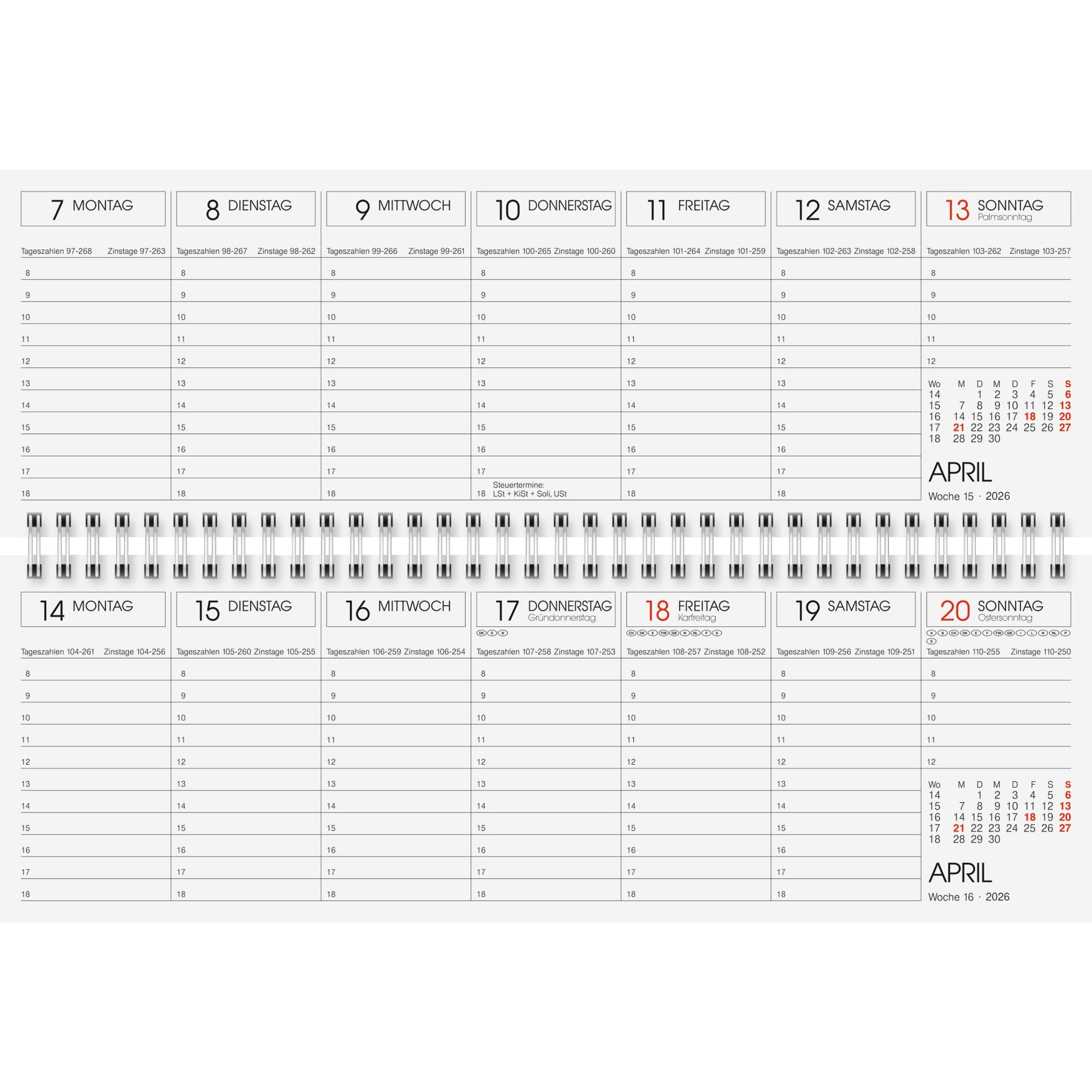 Ausführung des Inhalts (bzgl. der Hauptausstattungsteile): Jahresplan aktuelles Jahr und Folgejahr, 2 Seiten Monatsplan aktuelles Jahr, 1 Seite Adressen, 5 Seiten Wissenswertes, Ferientermine D
