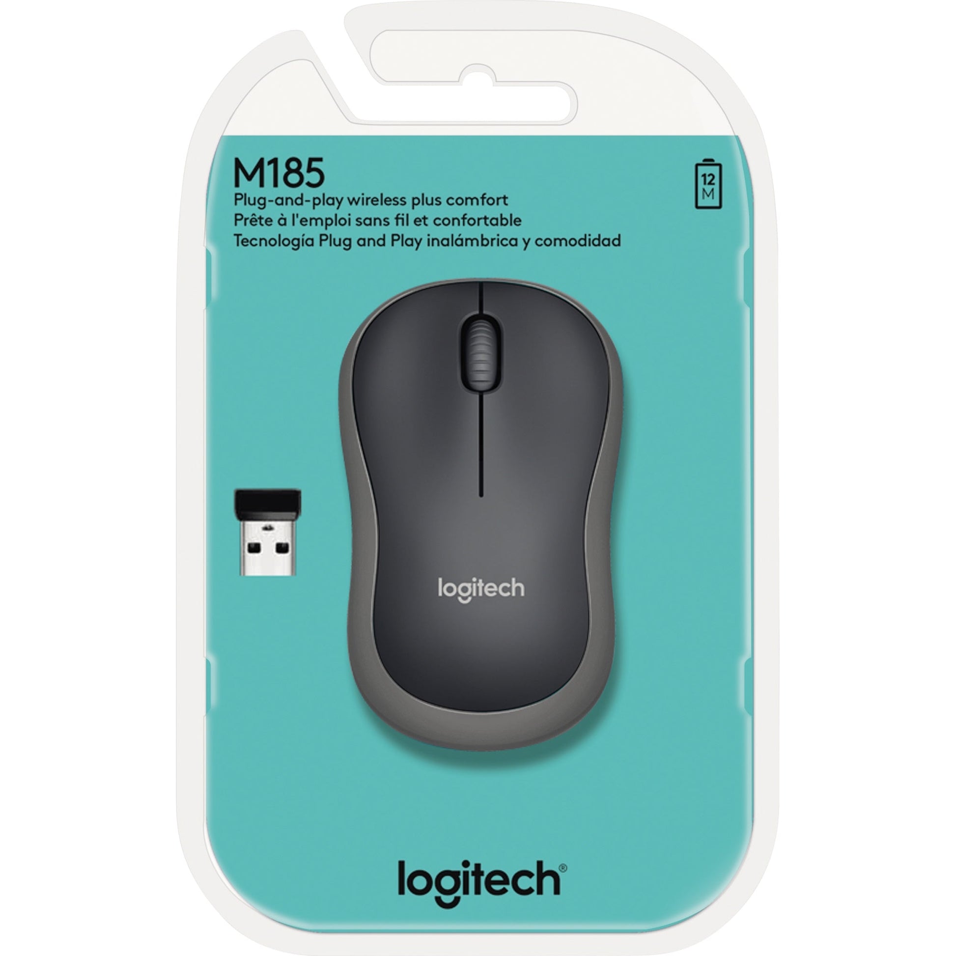 Bezeichnung: Logitech Optische PC Maus M185 Links- und Rechtshänder nicht ergonomisch USB-A bis 10m Batterie inkl. Nano-USB-Empfänger schwarz/grau