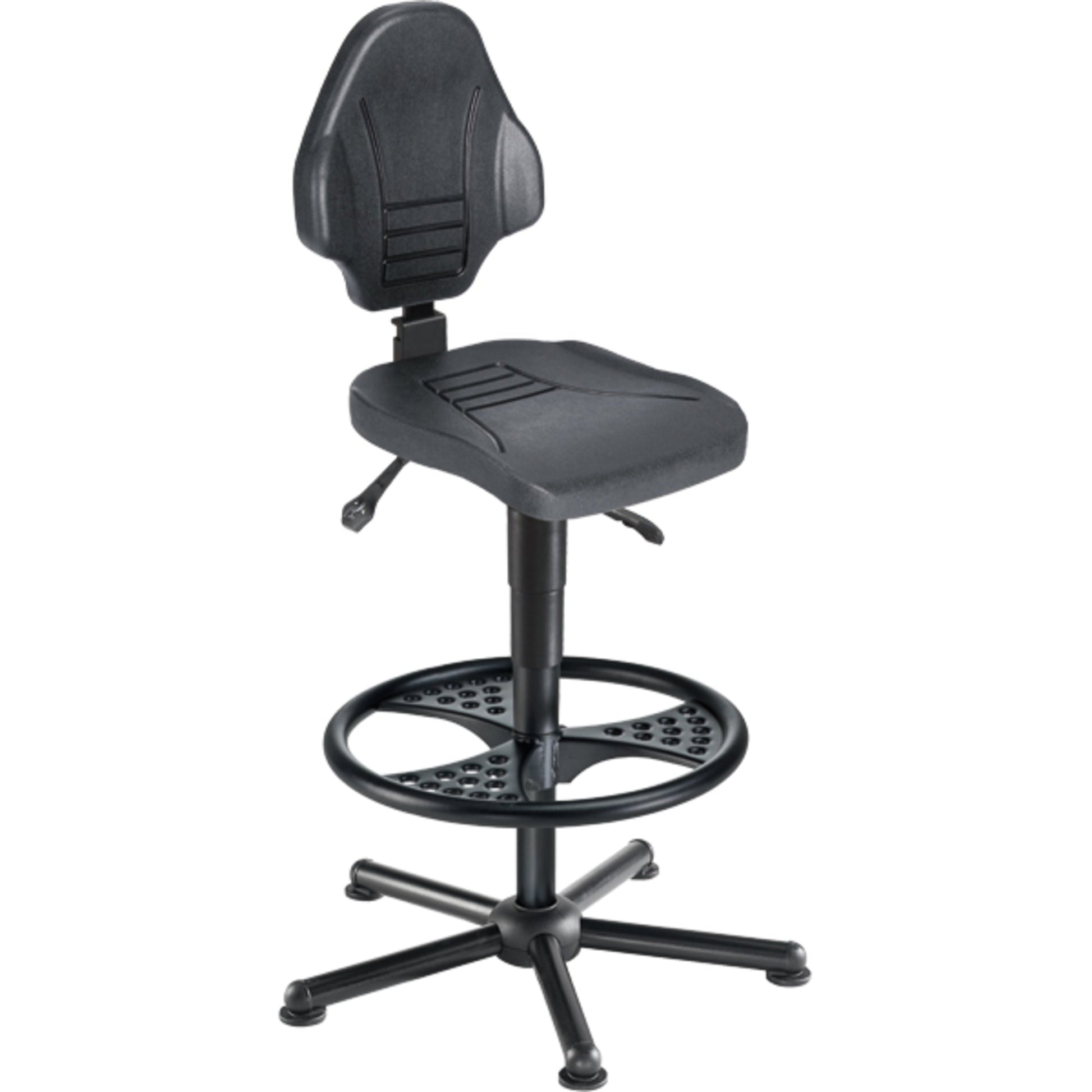 schwarzEin idealer Arbeitsstuhl für Werkstatt und Industrie muss nicht nur robust und langlebig verarbeitet sein, sondern auch den technischen Anforderungen eines ergonomischen Arbeitsplatzes entsprechen. Für lange Arbeitseinsätze geeignet. Strapazierfähige, große Sitzgarnituren. Mit breiter Rückenlehne. Sitzhöhenverstellung mittels Hebelauslösung. Mit höhenverstellbarem Fußring (Ø 580 mm), nicht drehbar. Rückenlehnenneigungsverstellung mit stufenloser Hebelauslösung (Anti-Schock).