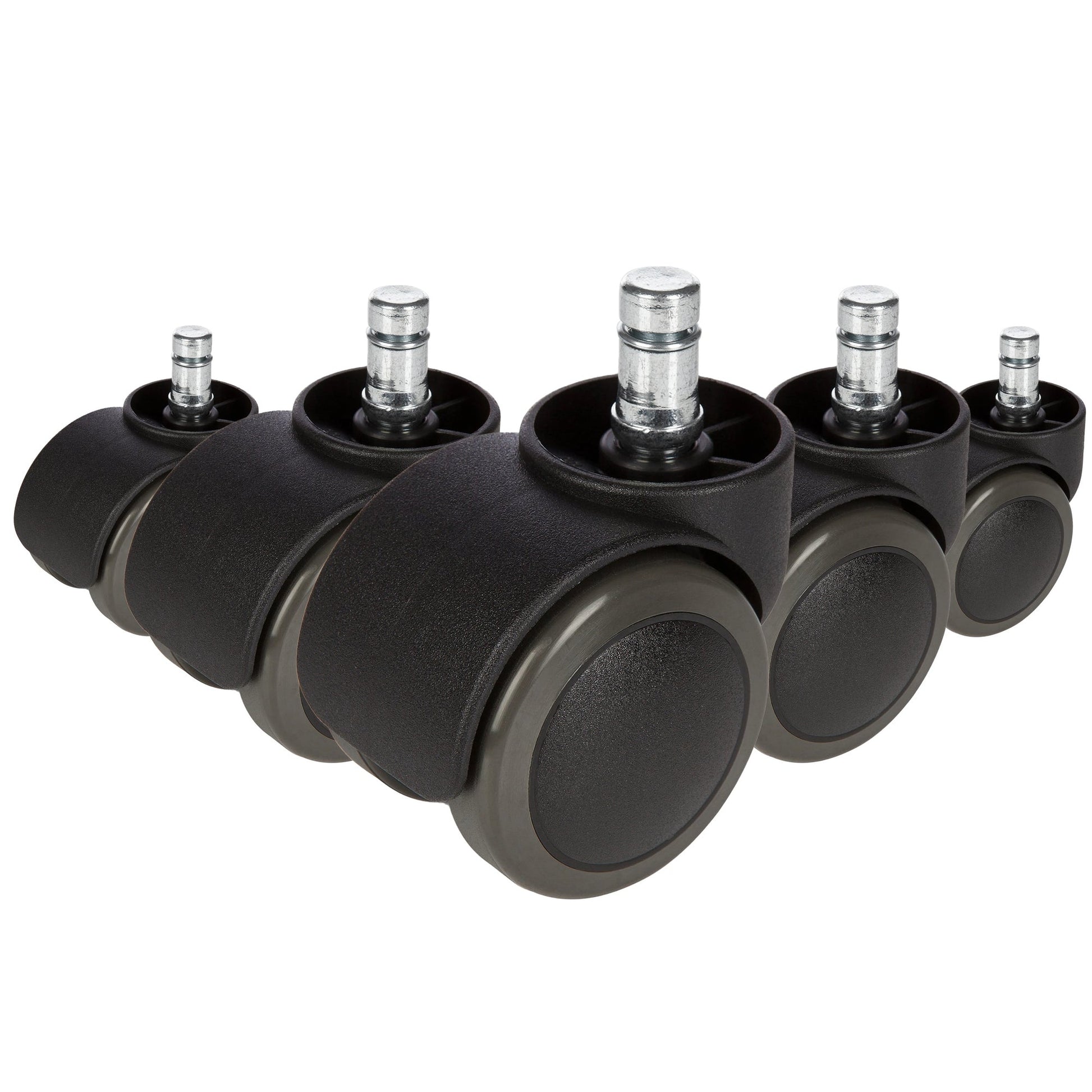 schwarzDie speziell beschichteten Laufflächen schützen Ihren hochwertigen Hartboden vor Kratzern und Blessuren die herkömmliche Teppichbodenrollen verursachen können. Das Auswechseln der Rollen ist schnell erledigt. Die alten Rollen lassen sich mit ein wenig Kraftaufwand ganz einfach abziehen. Dann nur noch die neuen Hartbodenrollen einstecken - fertig! Der Stuhl rollt nur unter Belastung. Steht man auf, so bremsen die Rollen, um ein ungewolltes Wegrollen zu verhindern. Bei Belastung öffnen sich die Rollen und der Stuhl rollt wieder. Bitte beachten Sie bei der Auswahl den richtigen Stiftdurchmesser und nehmen Sie idealerweise Ihre alten Rollen als Vorbild. Für ein optimales Messergebnis empfehlen wir, den Stiftdurchmesser der alten Rolle mit einer Schieblehre zu messen.