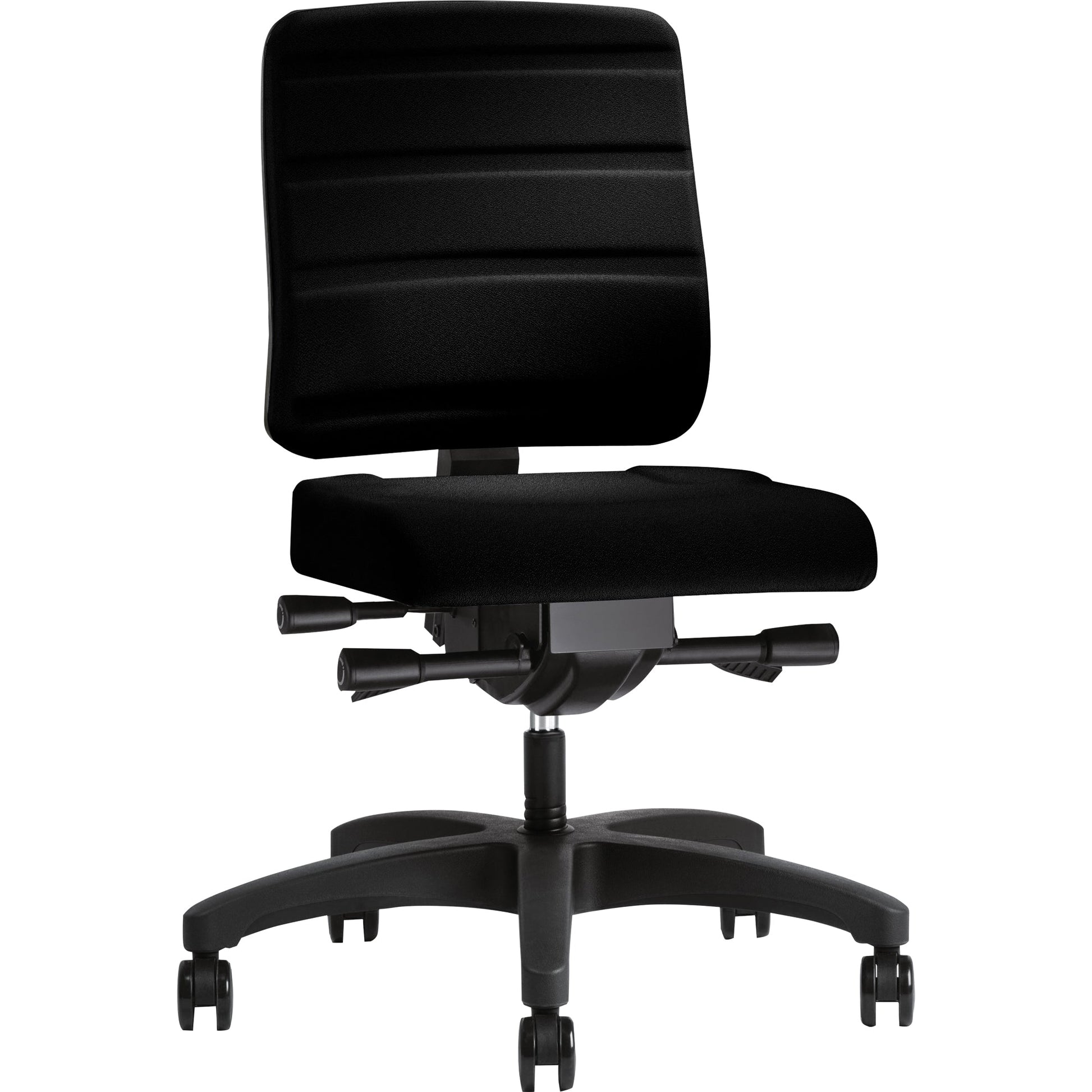 schwarzRückenlehne nieder, höhenverstellbar. Formschaumrücken mit individueller Designgebung. 3D-Rückenträger sowie einer Schaumdichte von 50 g/dm³. Erhöhter Sitzkomfort bei längerer Sitzdauer, da die höhere Schaumdichte das Durchsitzen des Schaumes verhindert. Desweiteren wird die Venenerweiterung im Gesäß vermieden und die Zirkulation gefördert. Synchronmechanik. Der Sitz und der Rücken bewegen sich synchron zueinander, der Stuhl folgt im geöffneten Zustand den Bewegungen des Sitzenden. Die Bewegung kann in jedem beliebigen Winkel arretiert werden. Der Gegendruck der Mechanik kann über ein Handrad stufenlos eingestellt werden.Durch den individuell definierbaren Druck kann der Stuhl auf die unterschiedlichen Körpergewichte eingestellt werden, und somit ein ermüdungsfreies Arbeiten bis über 8 Stunden realisiert werden. Die Lordosenunterstützung entlastet den Körper und nimmt ihm einen erheblichen Teil der Muskelarbeit ab, die für die sitzende Haltung erforderlich ist. Die Beckenunterstützung hilft dem Becken, auch über einen längeren Zeitraum in einer optionalen Sitzposition zu bleiben. So werden Muskulatur und Wirbelsäule dauerhaft entlastet.