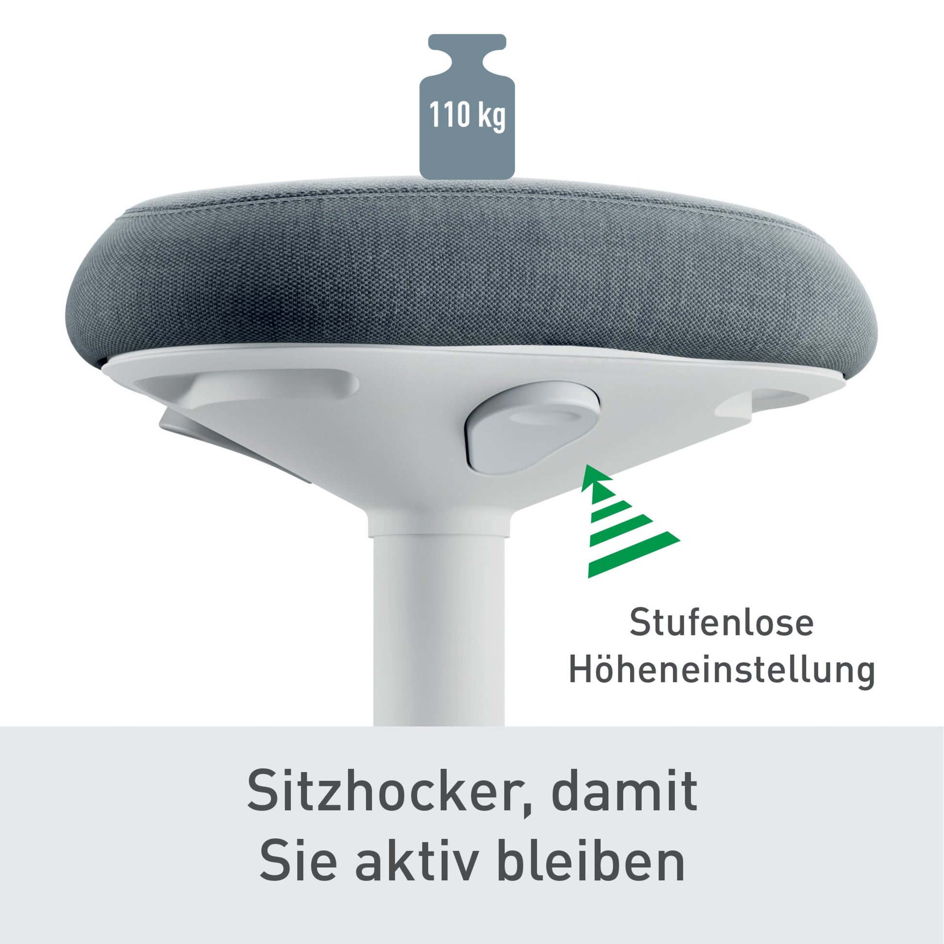 hellgrauErleben Sie den Leitz Sitzhocker Ergo Active - die perfekte Ergänzung für Ihr modernes Büro oder Home Office. Dieser innovative Sitzhocker fördert eine gesunde Sitzhaltung und unterstützt aktiv Ihre Beweglichkeit während der Arbeit. Mit seinem ergonomischen Design ermöglicht er ein dynamisches Sitzen, das Verspannungen und Rückenschmerzen vorbeugt. Die 9 cm dicke Sitzfläche des Komfortsitzes kann zum Anlehnen oder Sitzen verwendet werden, um Sie zu einer aufrechteren Sitzhaltung zu ermutigen und ein extrem bequemes Sitzerlebnis ähnlich wie bei einem Sitzkissen zu bieten. Bürohocker mit einzigartigem Komfortsitz in Dreiecksform aus Dual-Density-Foam (DDF) mit festem, ergonomischem Stützkern zur gleichmäßigen Verteilung des Gewichts auf das Becken, umgeben von weicher Schaumstoffpolsterung zur Reduzierung des Drucks auf die Oberschenkel und Beine, ähnlich wie bei einem Sattelhocker. Der abgerundete Sockel fördert Schaukel-, Wipp- und Drehbewegungen zur Stärkung von Rücken und Rumpf bei der Arbeit am Schreibtisch. Leichtgängige, pneumatische Höhenverstellung durch Drücken des Knopfes unterhalb des Sitzes, um die perfekte Sitzhöhe einzustellen. Abgerundete Standfläche mit rutschfester Gummiunterlage, um den Hocker vor dem Verrutschen zu bewahren und Ihren Boden zu schützen. Das leichte Design und der Tragegriff unter dem Sitz erleichtern den Transport von Raum zu Raum. Der Hocker ist nicht nur funktional, sondern auch stilvoll. Die schlichte, zeitgemäße Farbgebung fügt sich harmonisch in jede Büroumgebung ein und sorgt für eine ansprechende Atmosphäre. Dank der hochwertigen Materialien ist der Sitzhocker besonders langlebig und robust, sodass Sie lange Freude daran haben werden. Investieren Sie in Ihre Gesundheit und Produktivität mit diesem ergonomischen Sitzhocker. Erleben Sie, wie sich Ihre Konzentration und Ihr Wohlbefinden steigern, während Sie gleichzeitig stilvoll und modern ausgestattet sind. Bestellen Sie jetzt den Leitz Sitzhocker Ergo Active und bringen Sie frischen Wind in Ihren Arbeitsalltag!