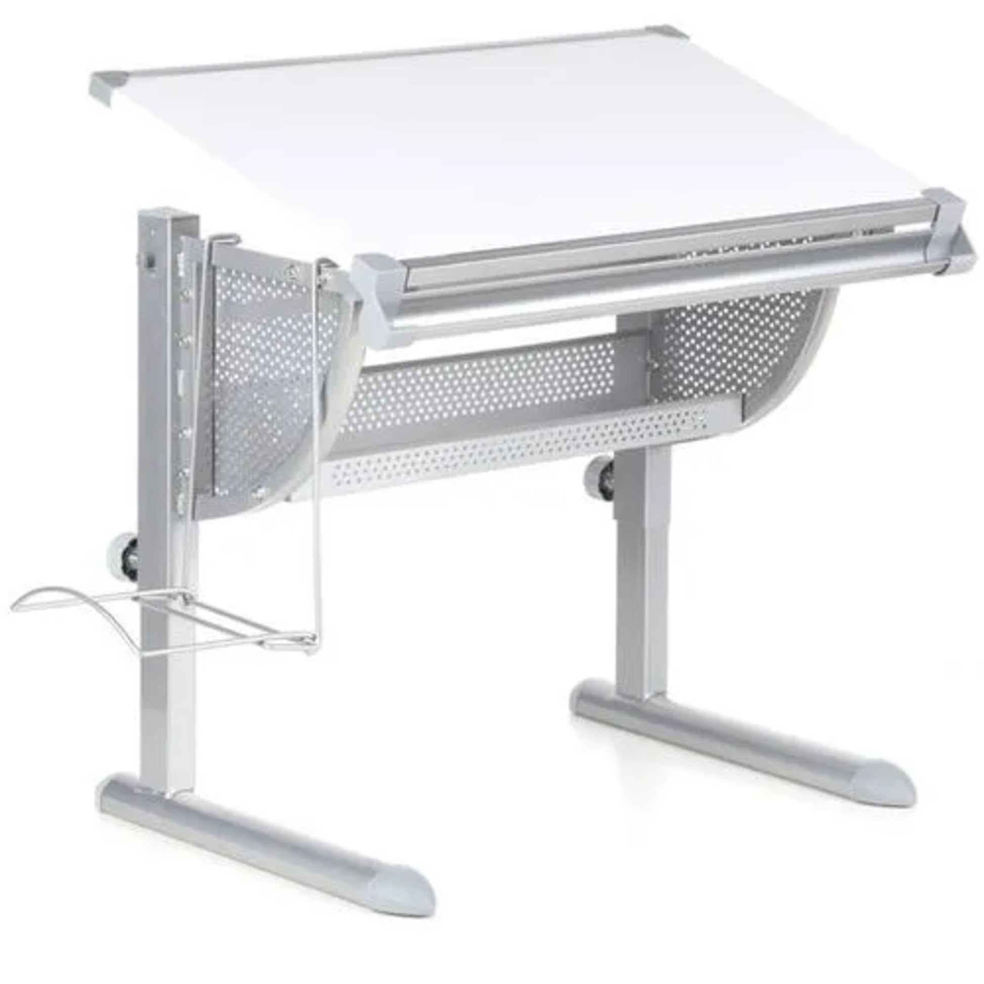 weißSo geht die Schule gleich richtig gut los! Ein Highlight für das Kinderzimmer. Mit dem Kinderschreibtisch BELIA macht das Lernen garantiert Spaß, denn spätestens mit der Vorschule / Schulanfang sitzt ein Kind täglich mehrere Stunden am Schreibtisch. Gerade bei Kindern bzw. Jugendlichen ist die Auswahl des passenden Kinderschreibtisches unter ergonomischen Gesichtspunkten entscheidend. Hier bietet dieser Schreibtisch entscheidenden Vorteile: 1. Qualität in der Verarbeitung 2. Die stabile Tischplatte ist neigbar und entspricht den ergonomischen Aspekten an einen kindgerechten Schreibtisch. Das Gestell ist robust gefertigt. Ideal zum lernen, schreiben und basteln. 3. Die Höhenverstellung des Schreibtisches ist über einen Schnappverschluss leicht zu verstellen. So kann der Schreibtisch viele Jahre genutzt werden. 4. Neben dem positiven Gesamteindruck stellt BELIA mit Details wie der Ablagefläche unter der Tischplatte für Schul- und Bastelsachen und natürlich die seitliche Ablagefläche der Schultasche, sowie mit der praktischen Stiftablage und dem eingearbeitetem Lineal eindrucksvoll unter Beweis, dass er auch in Sachen Funktionalität seine Hausaufgaben gemacht hat. Altersempfehlung: ca. 4 - 17 Jahre. Tischfläche 10-fach im Raster höhenverstellbar mittels Schraubverschluss. Tischfläche 10-fach neigungsverstellbar durch massiven Metallbeschlag.