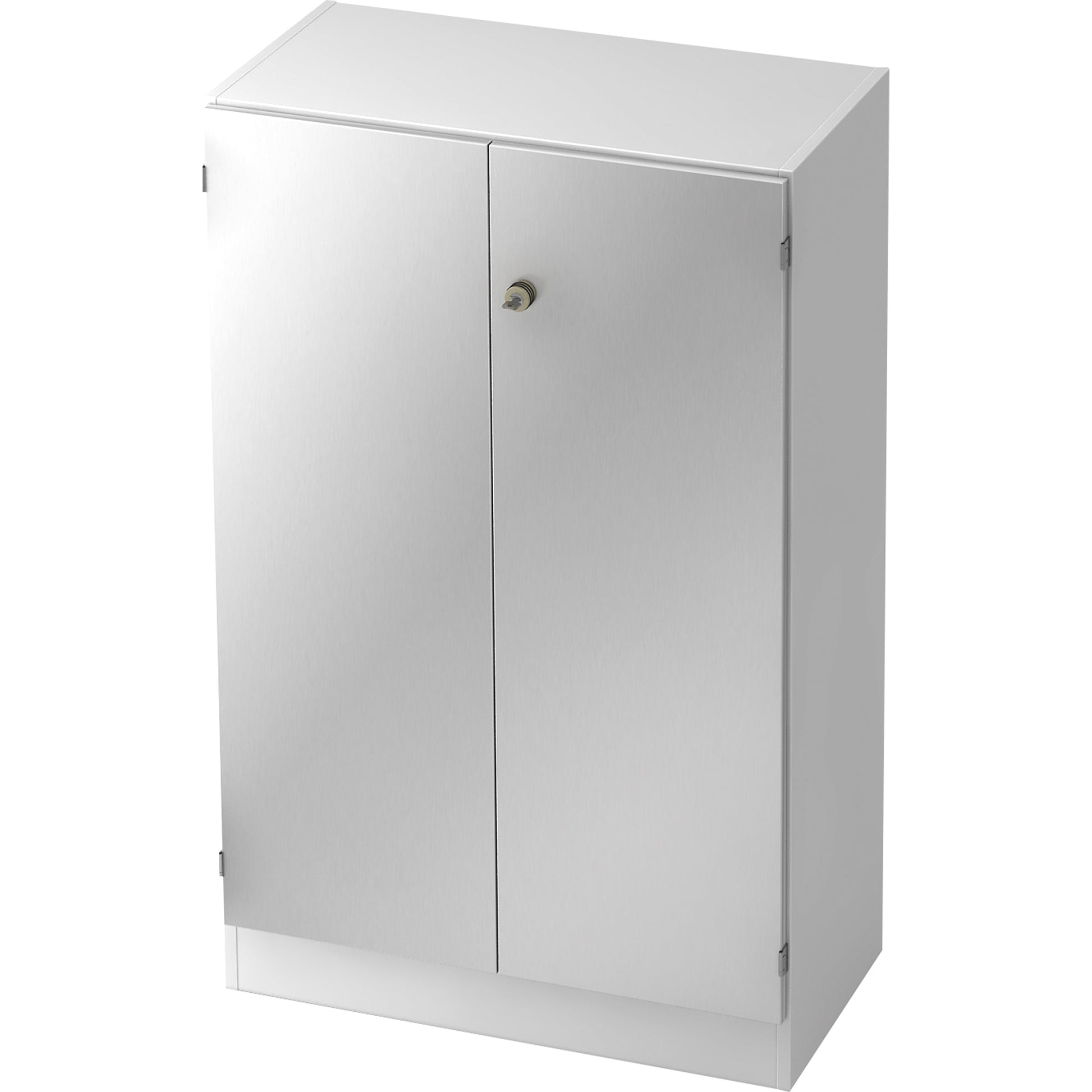 Bezeichnung: Hammerbacher Flügeltürenschrank 800 x 1.270 x 420 mm (B x H x T) 2 Fachböden Spanplatte Farbe der Front: weiß Farbe des Korpus: silber