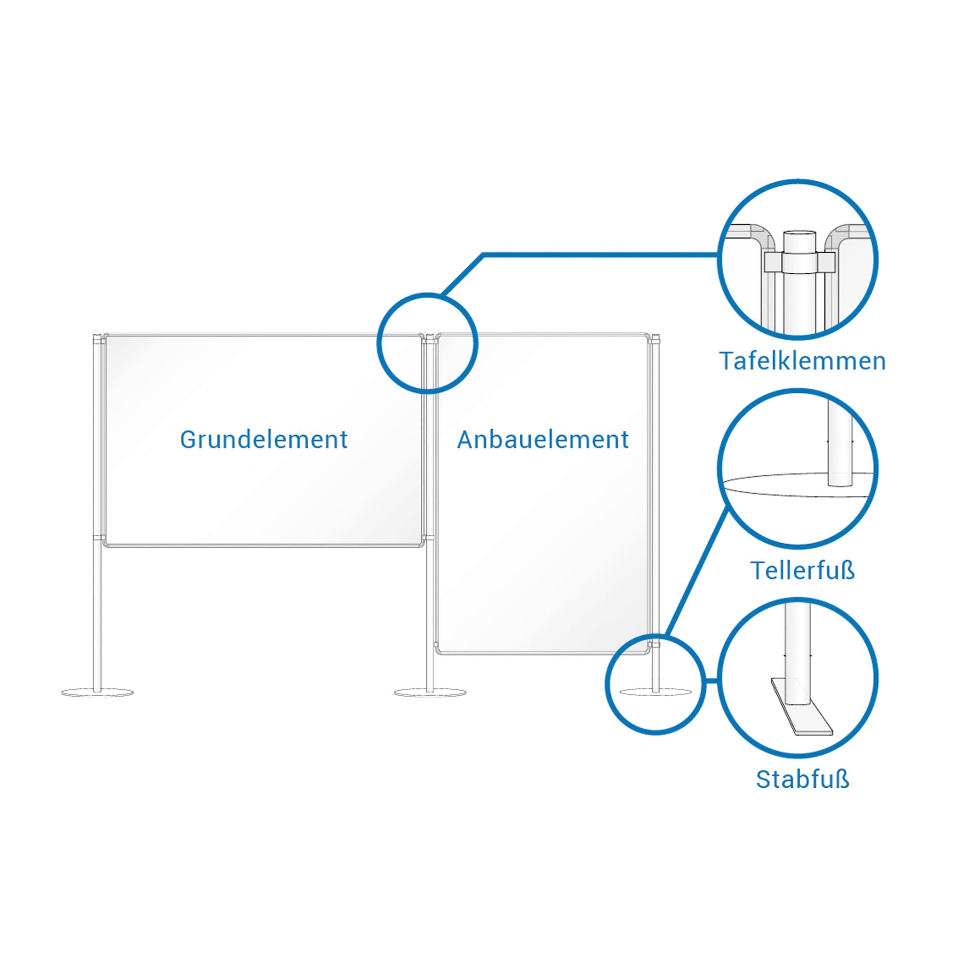 Bezeichnung: Ultradex Whiteboard FAIR Maße der Oberfläche: 200 x 120 cm (B x H) Tafel magnethaftend beidseitig beschreibbar inkl. 2 Standrohre, 2 Füße, 4 Tafelklemmen, Innensechskantschlüssel Stahl lackiert weiß