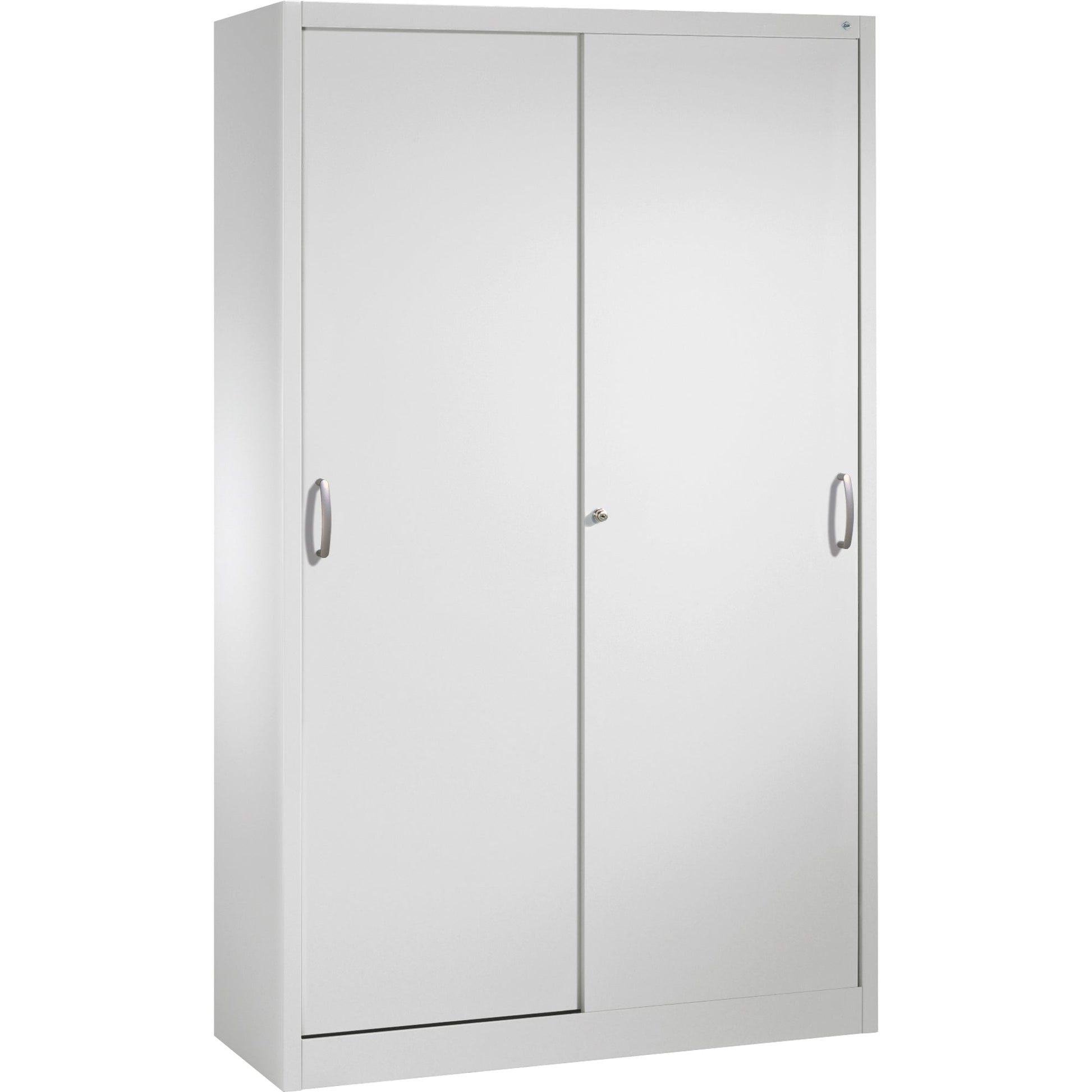 lichtgrauStahl-Schiebetürenschrank Serie 2000. Türen mit Leichtlaufrollen in spezieller Schienenführung. Einlegeboden verzinkt mit hoher Traglast. Ergonomischer Griff für einfache Bedienung. Achtung: Anlieferungsmöglichkeit durch Sattelschlepper muss gegeben sein.