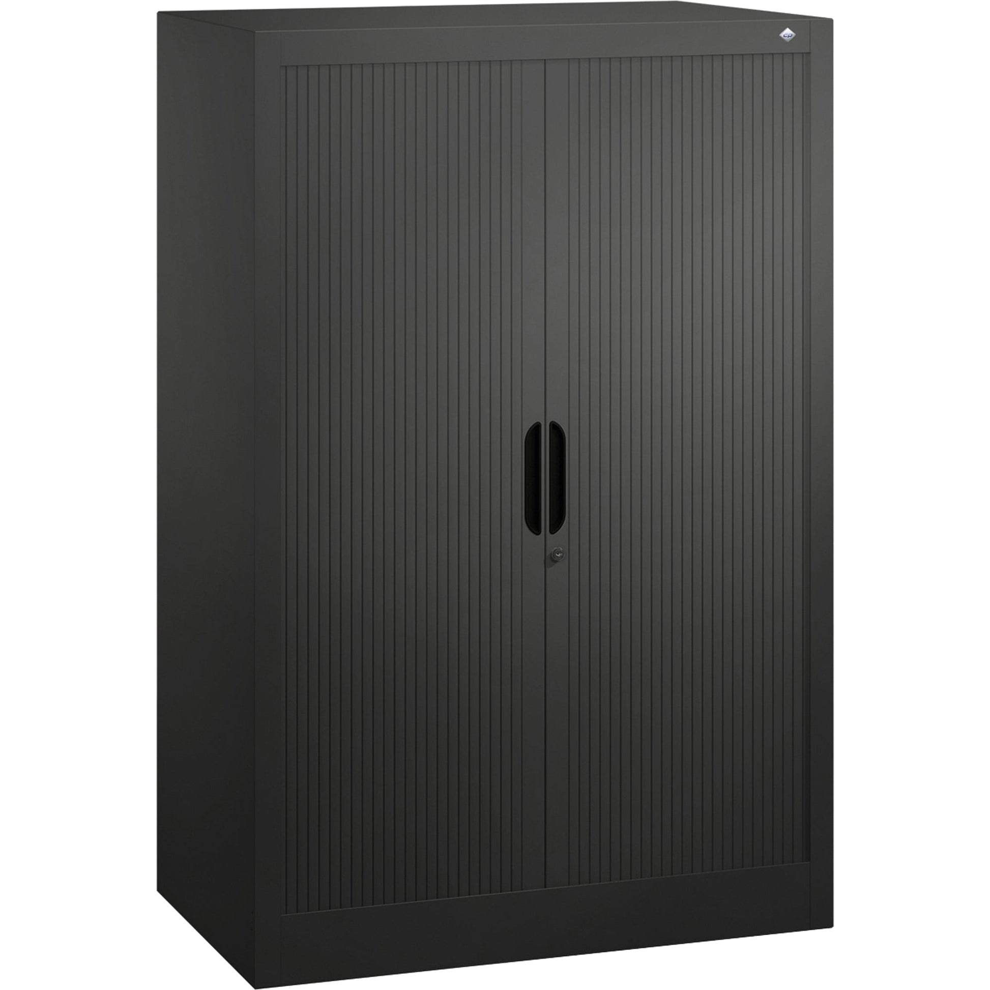schwarzgrauBüro-Sideboard Omnispace. Leichtgängige Rollladentür. Niveauregulierung von innen einstellbar. Voller Zugriff auf den Innenraum. Rollladentür mittig anschlagend mit Hakenriegelschloss. Achtung: Anlieferungsmöglichkeit durch Sattelschlepper muss gegeben sein.