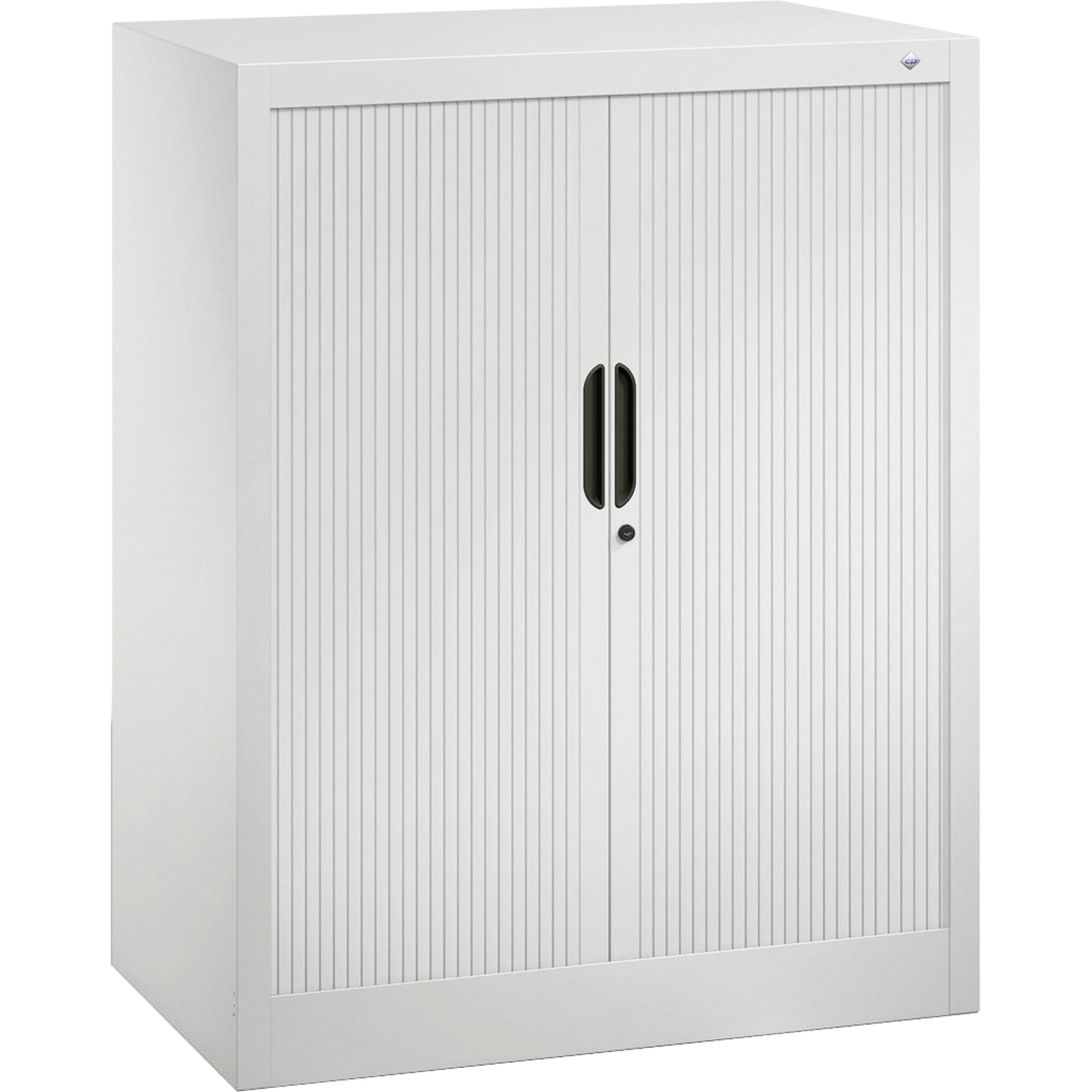lichtgrauBüro-Sideboard Omnispace. Leichtgängige Rollladentür. Niveauregulierung von innen einstellbar. Voller Zugriff auf den Innenraum. Rollladentür mittig anschlagend mit Hakenriegelschloss. Achtung: Anlieferungsmöglichkeit durch Sattelschlepper muss gegeben sein.