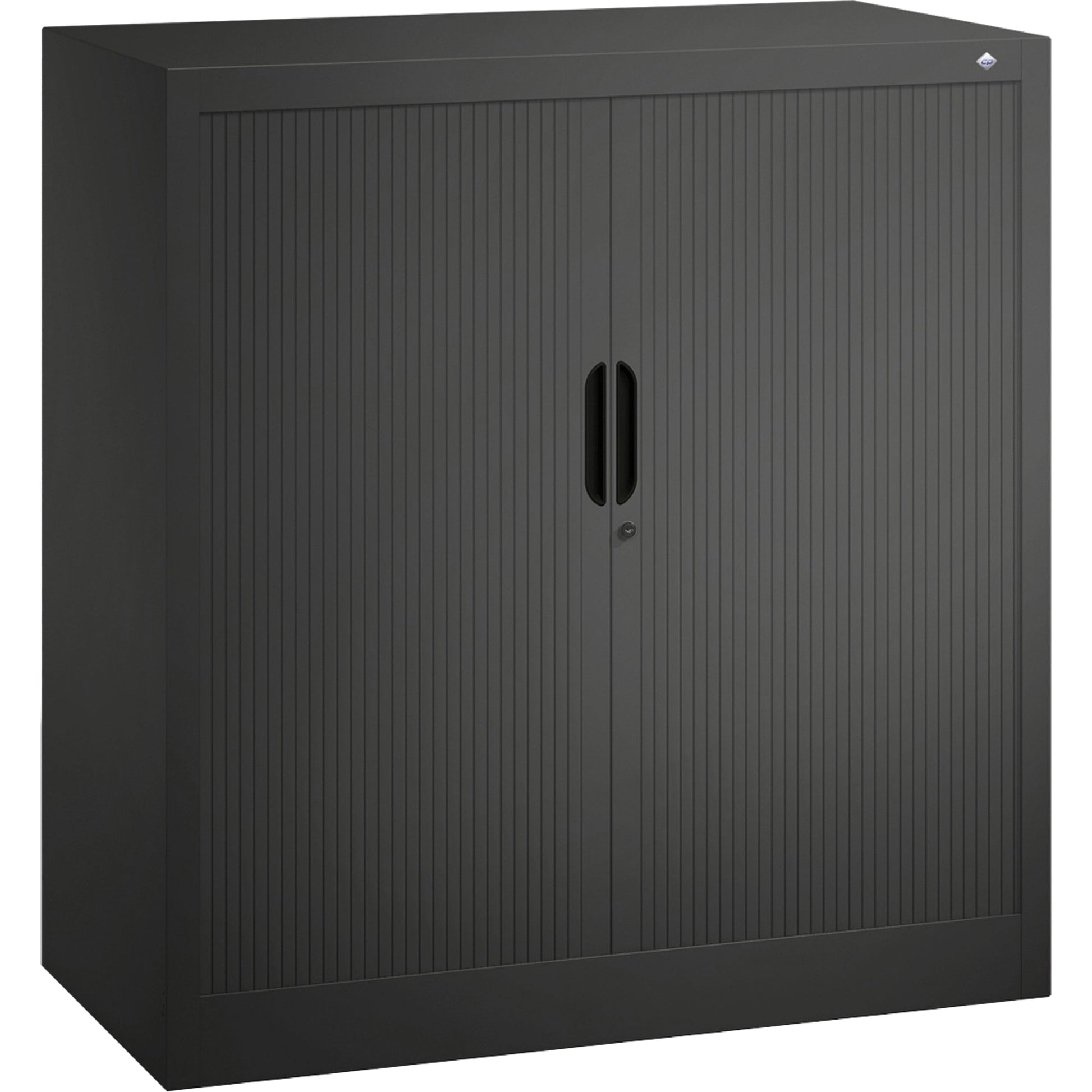 schwarzgrauBüro-Sideboard Omnispace. Leichtgängige Rollladentür. Niveauregulierung von innen einstellbar. Voller Zugriff auf den Innenraum. Rollladentür mittig anschlagend mit Hakenriegelschloss. Achtung: Anlieferungsmöglichkeit durch Sattelschlepper muss gegeben sein.