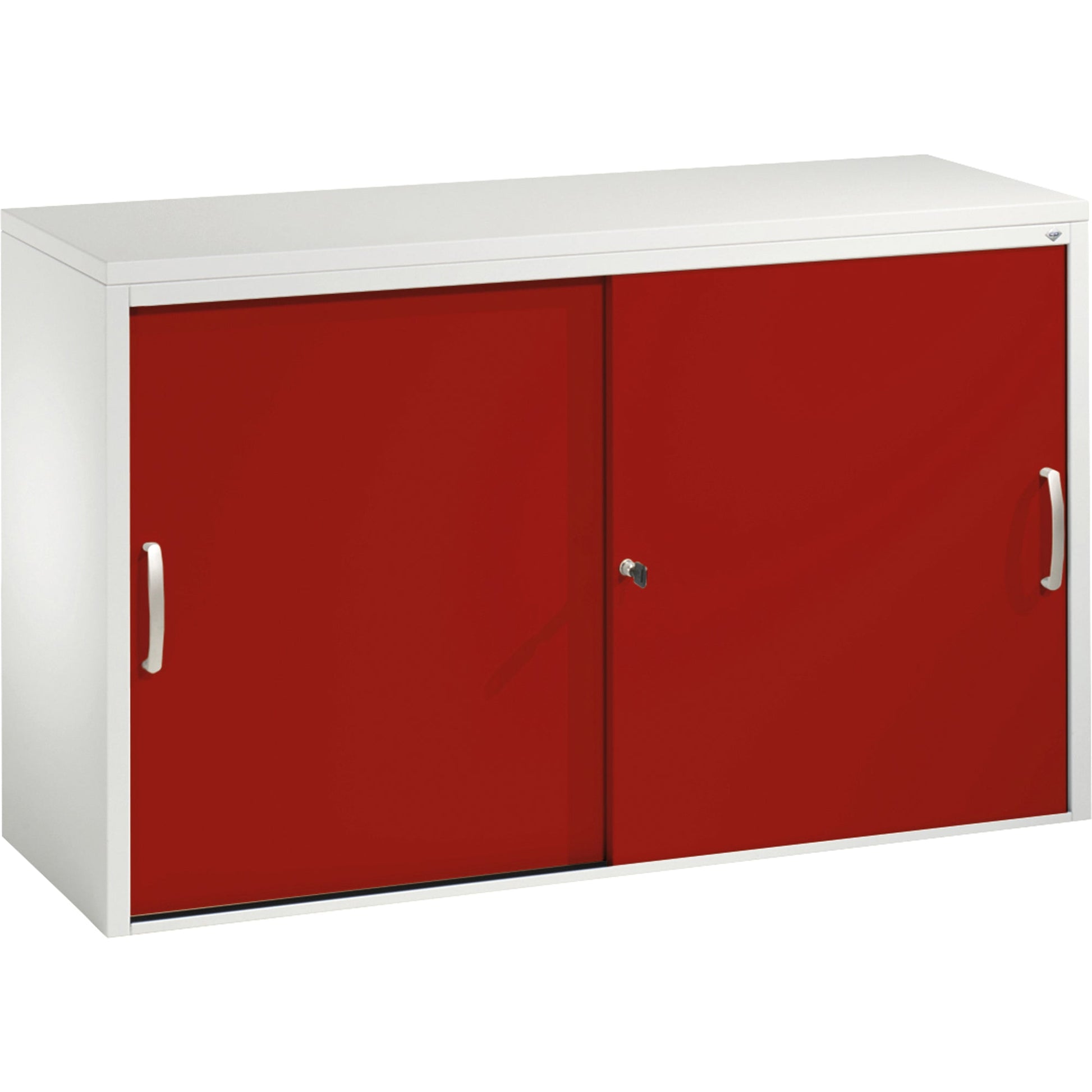 Bezeichnung: C+P Schiebetürenschrank Acurado 1.200 x 720 x 400 mm (B x H x T) 2 Fachböden Stahl, lackiert Farbe der Front: rubinrot Farbe des Korpus: lichtgrau
