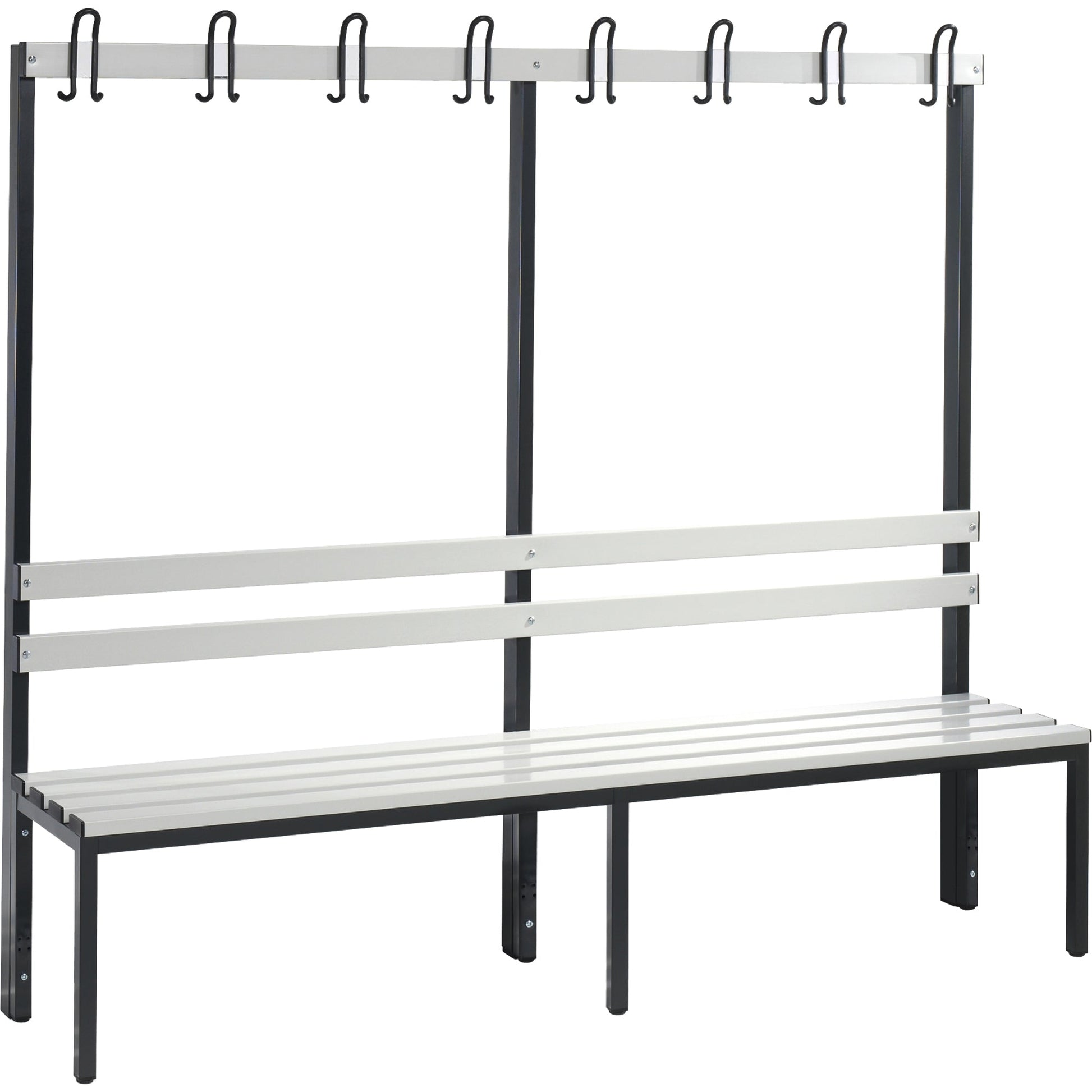 lichtgrauGarderobenbank aus stabilem Vierkant-Stahlrohr 30 x 30 mm. Mit Rückenlehne und Garderobenleiste sowie austauschbarem Beschriftungsschild. Schuhrost aus Rundmetall, Sitzleisten, Rückenlehne und Garderobenleiste aus Kunststoff mit Stahlkern für hohe Stabilität. Verstellbare Bodengleiter mit 10 mm Niveauregulierung. Achtung: Anlieferungsmöglichkeit durch Sattelschlepper muss gegeben sein.