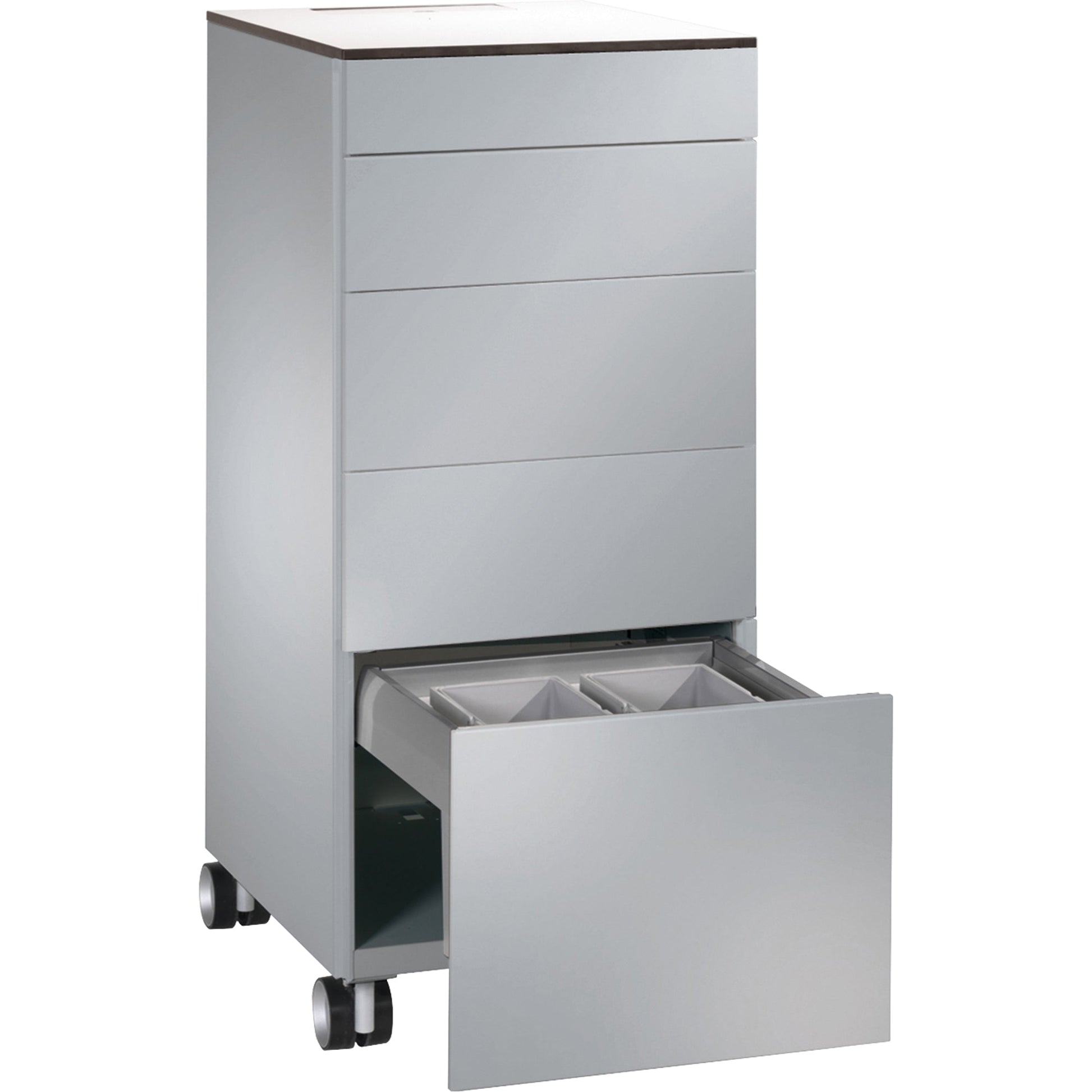 weißaluminiumVordere Rollen feststellbar. Schubladen auf langlebigen 2-fach Präzisions-Teleskopschienen mit Zahnradführung und hoher Traglast. Inkl. End-Selbst-Einzug und Soft-Stop. 1. Schublade leer zur individuellen Nutzung, 2. Schublade mit Besteckfach und Kleinteileschubkasten aus Edelstahl, 3. Schublade mit variabler Einrichtung für Tassen und Gläser, 4. Schublade für Teller und Untertassen, Abfallsammler mit drei Behältern zur sauberen Trennung (1 x 18 l, 2 x 8 l). Schubladenblenden aus Stahl, doppelwandig, bedienerfreundliche, an den Seiten durchgehende Griffleisten. 13 mm HPL-Abdeckplatte aus Hochdruckschichtstoff. Einbausteckdose unterhalb der HPL-Abdeckplatte mit integrierter Kabelklappe. Achtung: Anlieferungsmöglichkeit durch Sattelschlepper muss gegeben sein.
