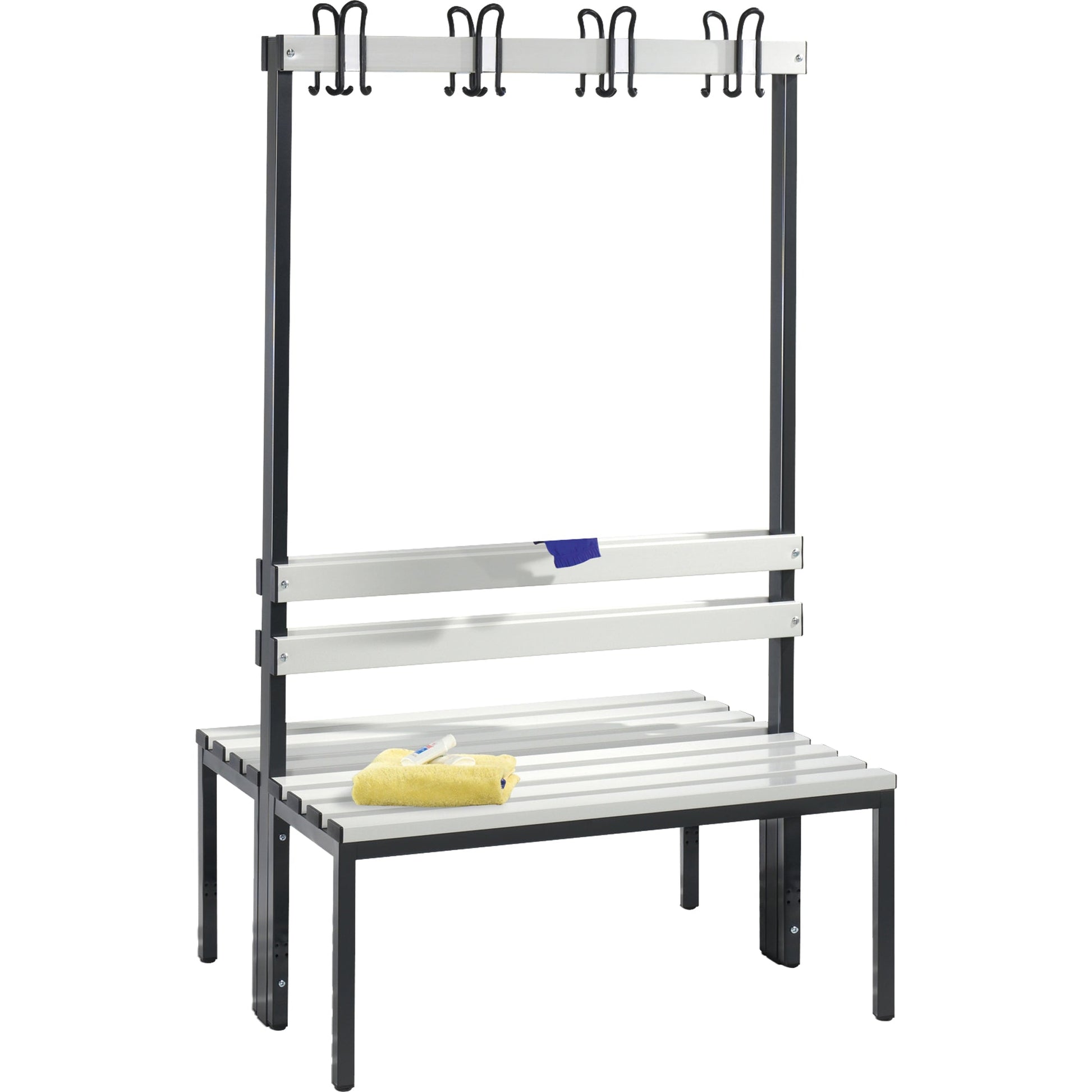 schwarzGestell stabilem Vierkant-Stahlrohr 30 x 30 mm. Mit Rückenlehnen, Garderobenleisten sowie austauschbarem Beschriftungsschild. Schuhrost aus Rundmetall, Sitzleisten, Rückenlehnen und Garderobenleisten aus Kunststoff mit Stahlkern für hohe Stabilität. Verstellbare Bodengleiter mit 10 mm Niveauregulierung. Achtung: Anlieferungsmöglichkeit durch Sattelschlepper muss gegeben sein.