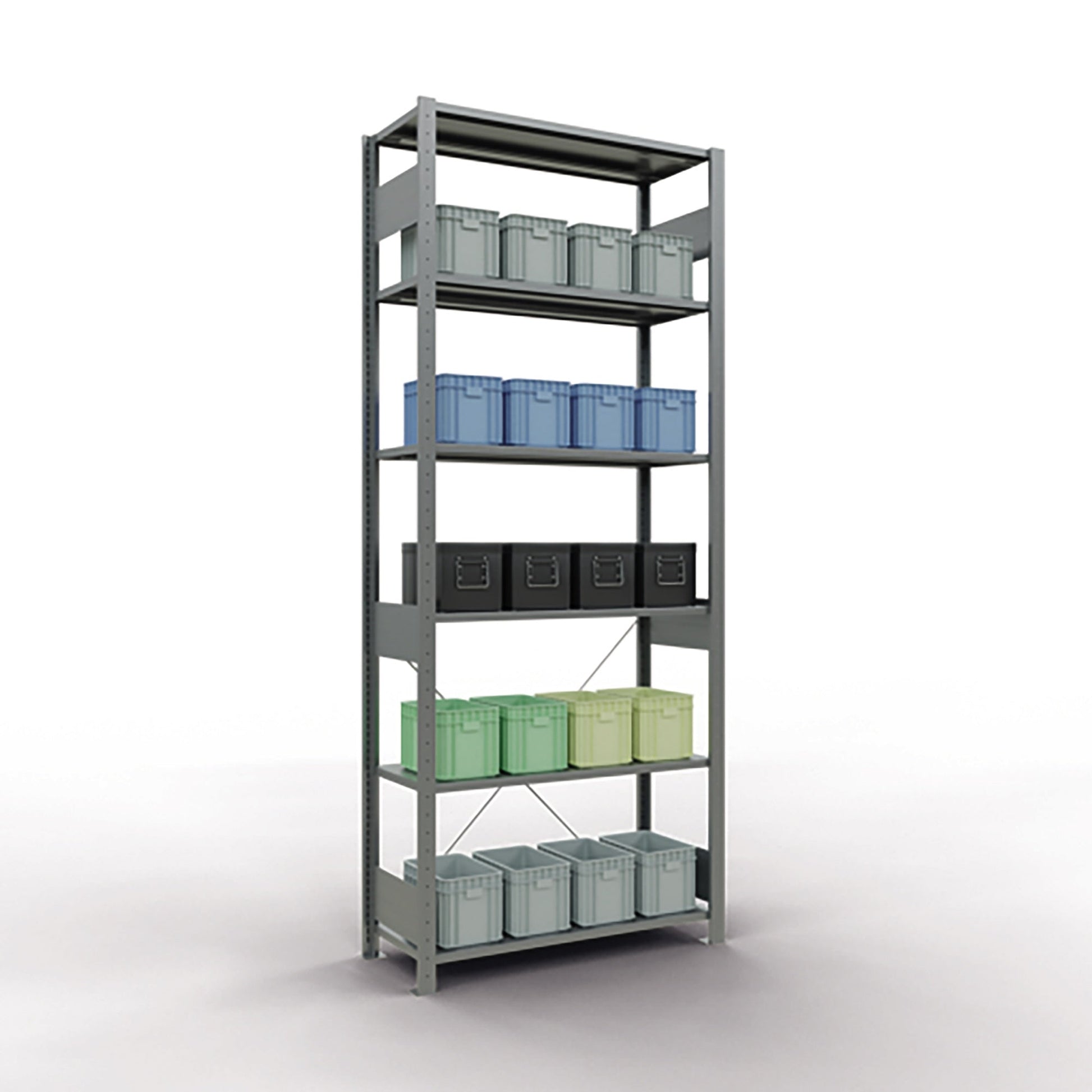silberAussteifung durch Kreuzstrebe. Einfaches Ausrichten des Regals durch Spannschlösser an den Kreuzstreben.Ideal zum Aufbau von Regalzeilen vor Wänden und als Doppelregal Rücken an Rücken. Fachböden im Raster in der Höhe verstellbar. Geeignet zum Bau mehrstöckiger Regalanlagen. Schneller Aufbau durch ein faches Stecken der Fachböden.