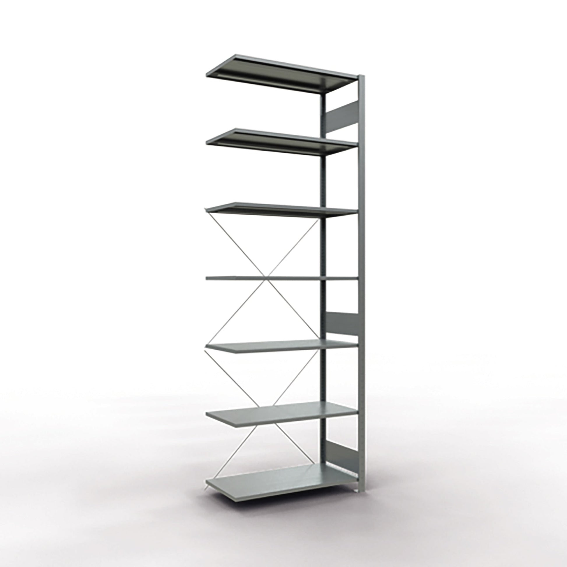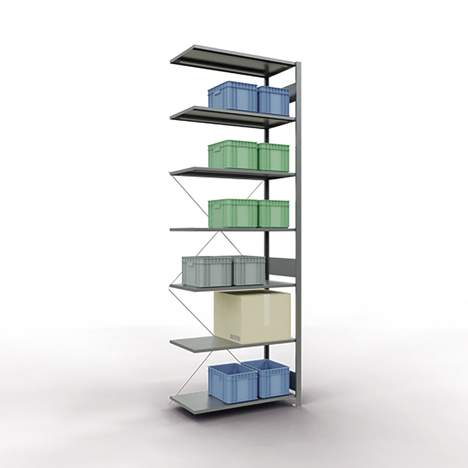 silberAussteifung durch Kreuzstrebe. Einfaches Ausrichten des Regals durch Spannschlösser an den Kreuzstreben.Ideal zum Aufbau von Regalzeilen vor Wänden und als Doppelregal Rücken an Rücken. Fachböden im Raster in der Höhe verstellbar. Geeignet zum Bau mehrstöckiger Regalanlagen. Schneller Aufbau durch einfaches Stecken der Fachböden.