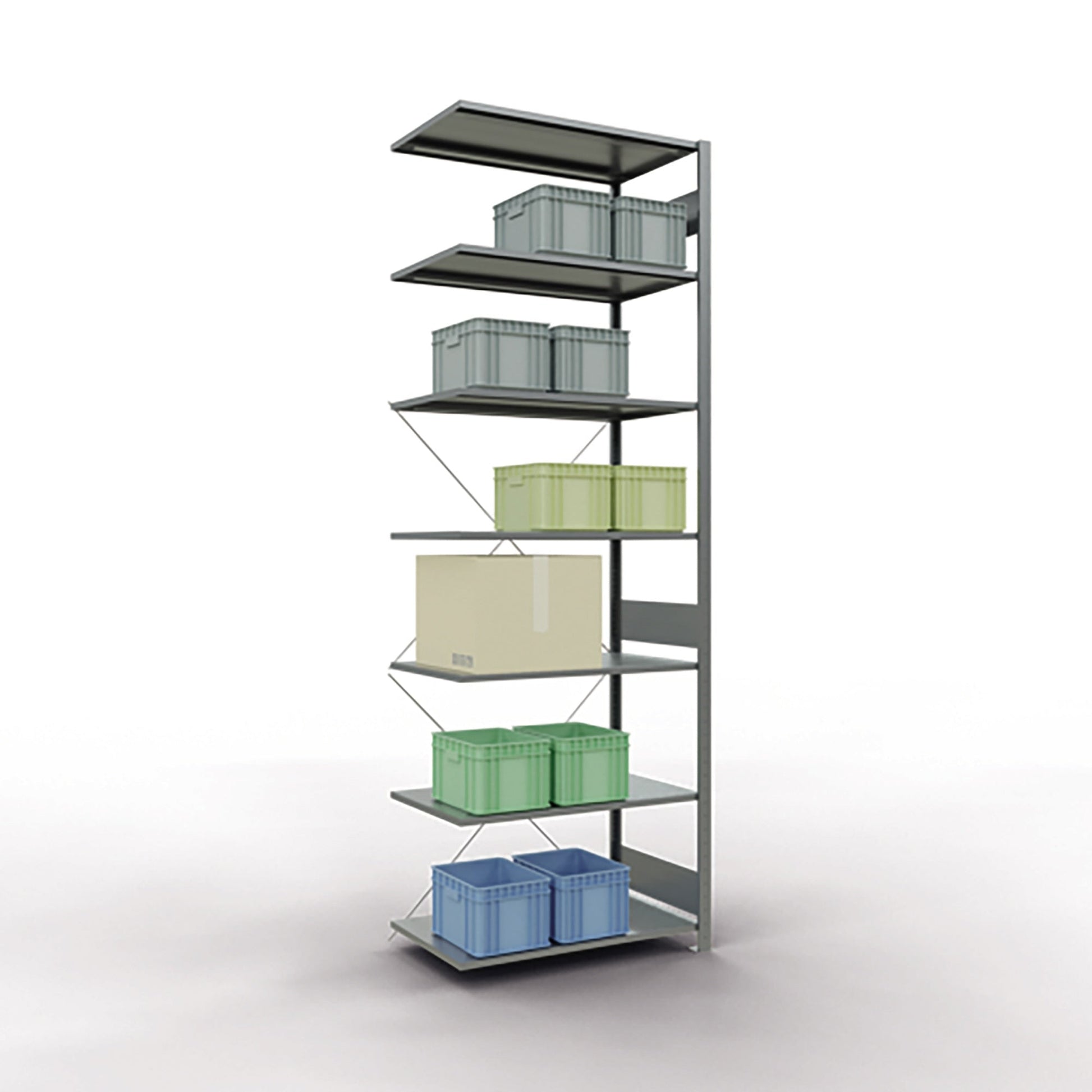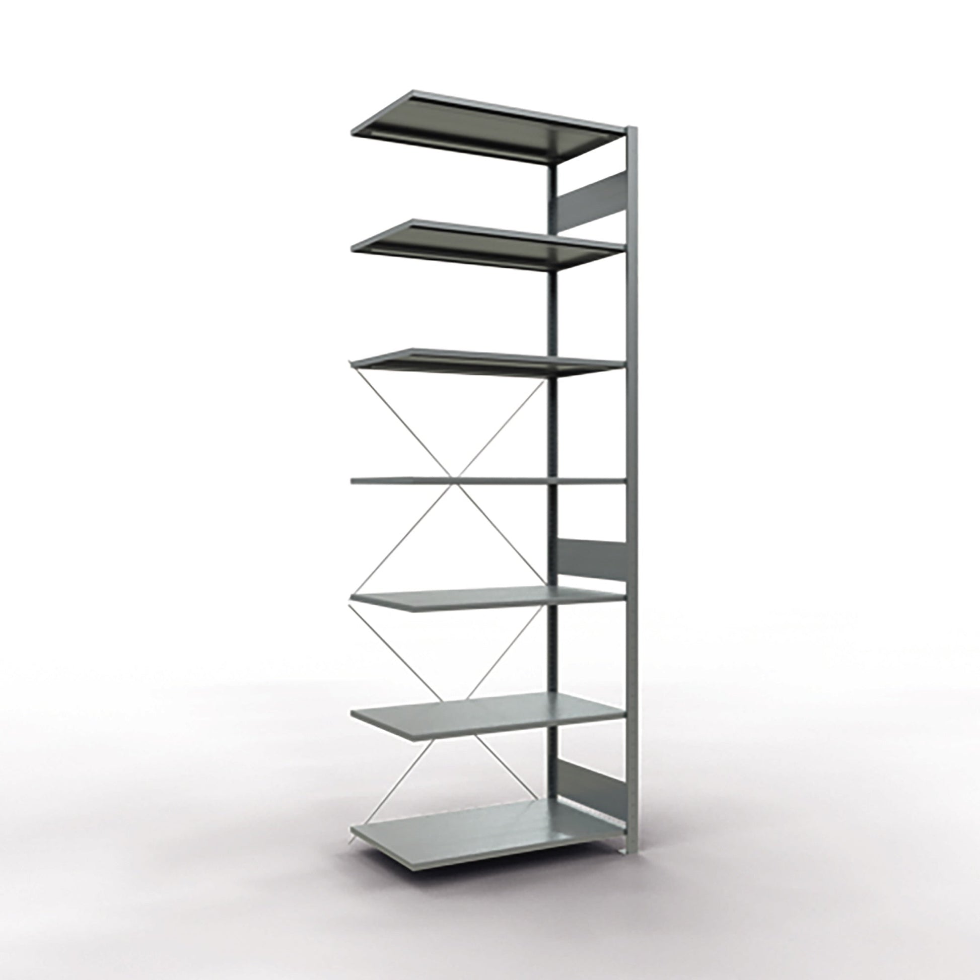 silberAussteifung durch Kreuzstrebe. Einfaches Ausrichten des Regals durch Spannschlösser an den Kreuzstreben.Ideal zum Aufbau von Regalzeilen vor Wänden und als Doppelregal Rücken an Rücken. Fachböden im Raster in der Höhe verstellbar. Geeignet zum Bau mehrstöckiger Regalanlagen. Schneller Aufbau durch einfaches Stecken der Fachböden.