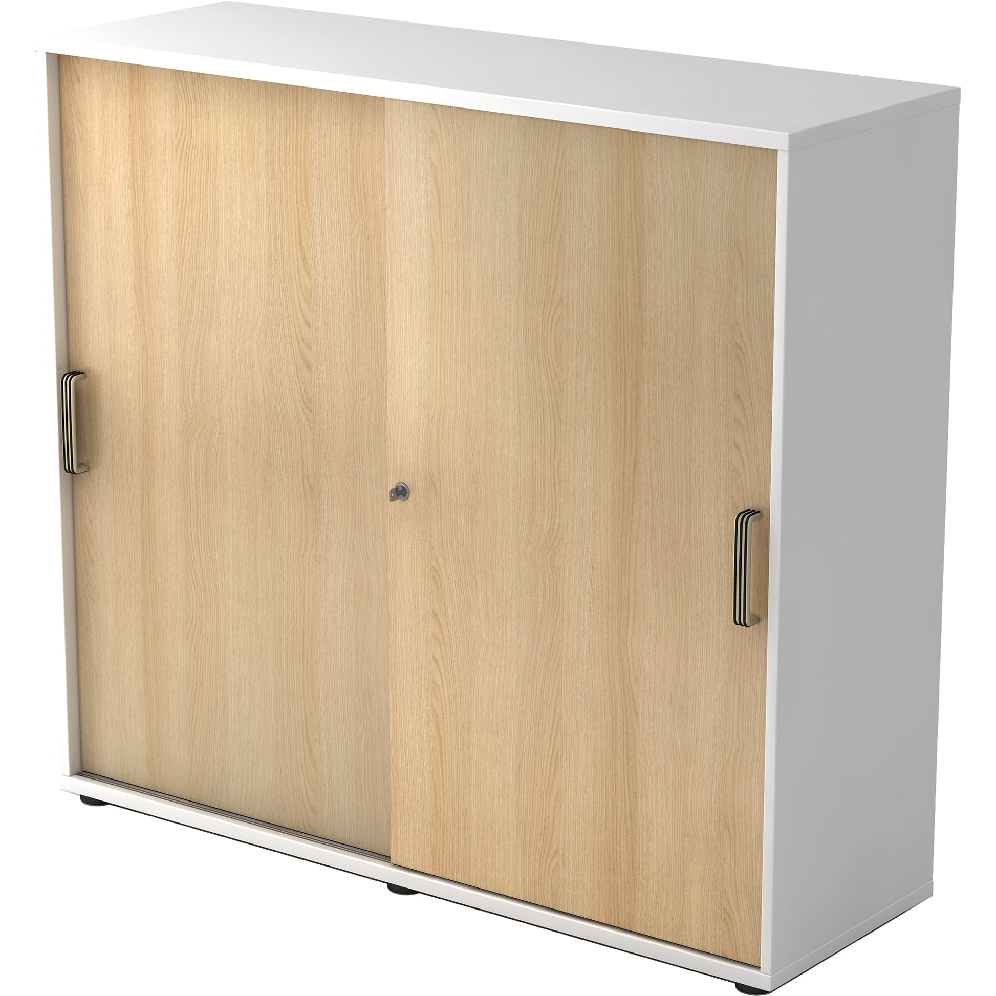Bezeichnung: Hammerbacher Schiebetürenschrank 1.200 x 1.100 x 400 mm (B x H x T) Spanplatte, melaminharzbeschichtet Farbe der Front: eiche Farbe des Korpus: weiß