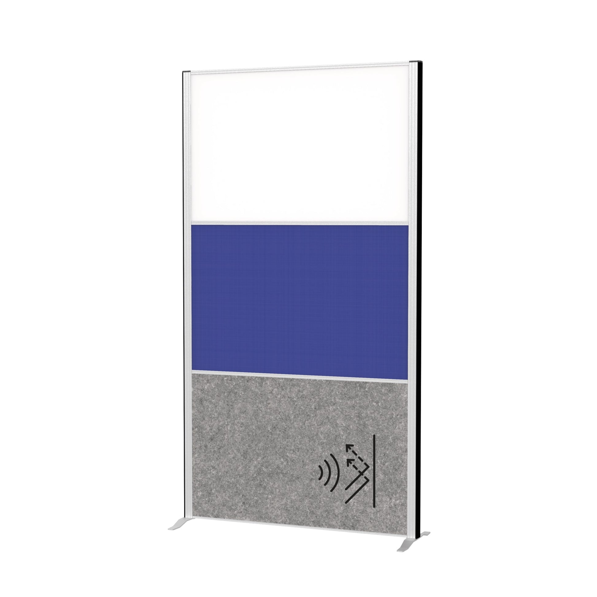 silberModulare, freistehende Trennwand/Akustikwand für moderne Raumkonzepte, das Raumteiler-System vereint Konzentration mit Kommunikation und ist individuell gestaltbar. Open Space Lösungen: Konzentrationszonen mit Lärmschutz und verbesserter Akustik, Privacy Spaces durch Sichtschutz, für Kreativmeetings oder als Infowand. Module gesteckt und durch Schrauben fixiert. Extrem flexibel: Lückenlose Klettverbindung. Räume umgestalten: Mehrere Stellwände aneinanderreihen, schnell aufbauen und jederzeit einfach werkzeuglos umstellen. Im Büro rund um den Schreibtisch, im Callcenter, Konferenzzimmer oder Besprechungsraum, für eine Raum in Raum-Lösung oder im Home Office. Edles Design: Moderne Kombination von Rahmenfarbe und Oberfläche, dezentes Profil mit abgerundeten Kanten und dekorativen Rillen. Bodentiefer, blickdichter Sichtschutz: Abstand Boden zu Tafel-Unterkante nur 2 cm. Umlaufendes Rahmenprofil (Stärke 44 mm).