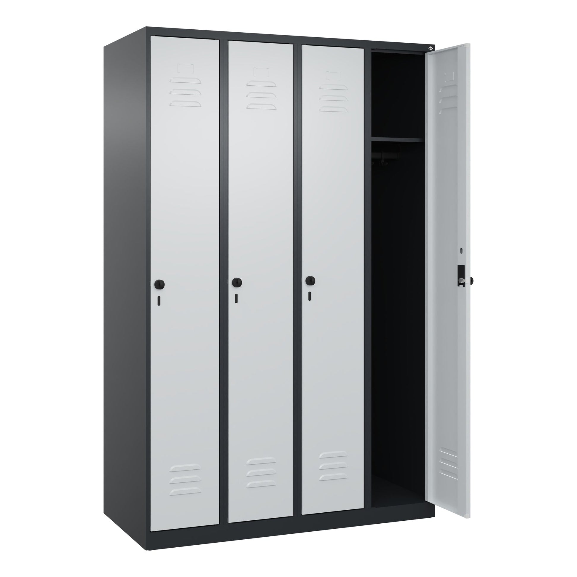 Bezeichnung: C+P Kleiderspind Classic PLUS 1.200 x 1.850 x 500 mm (B x H x T) 4 Abteile Stahl Farbe der Front: lichtgrau Farbe des Korpus: schwarzgrau