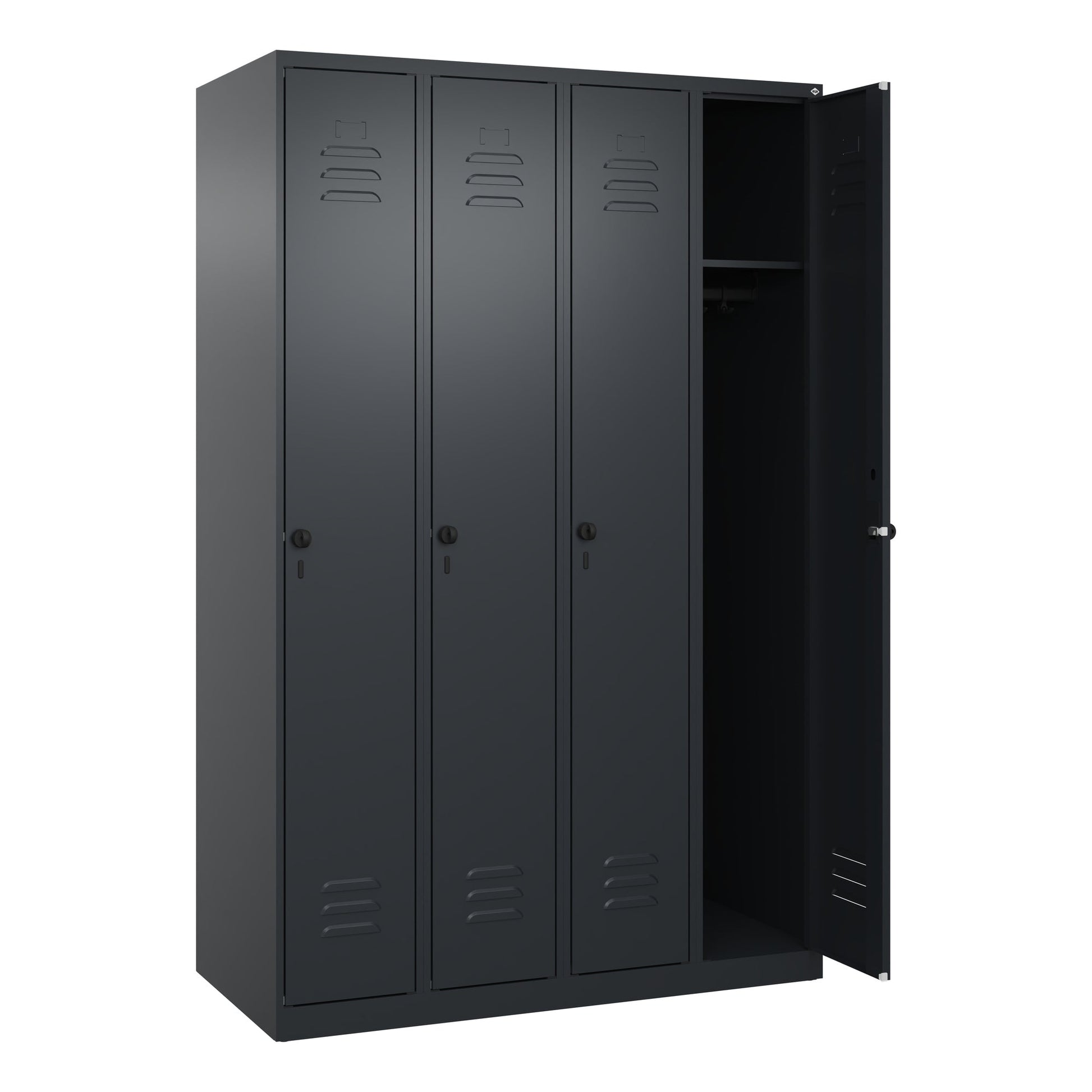 Bezeichnung: C+P Kleiderspind Classic PLUS 1.200 x 1.850 x 500 mm (B x H x T) 4 Abteile Stahl Farbe der Front: schwarzgrau Farbe des Korpus: schwarzgrau