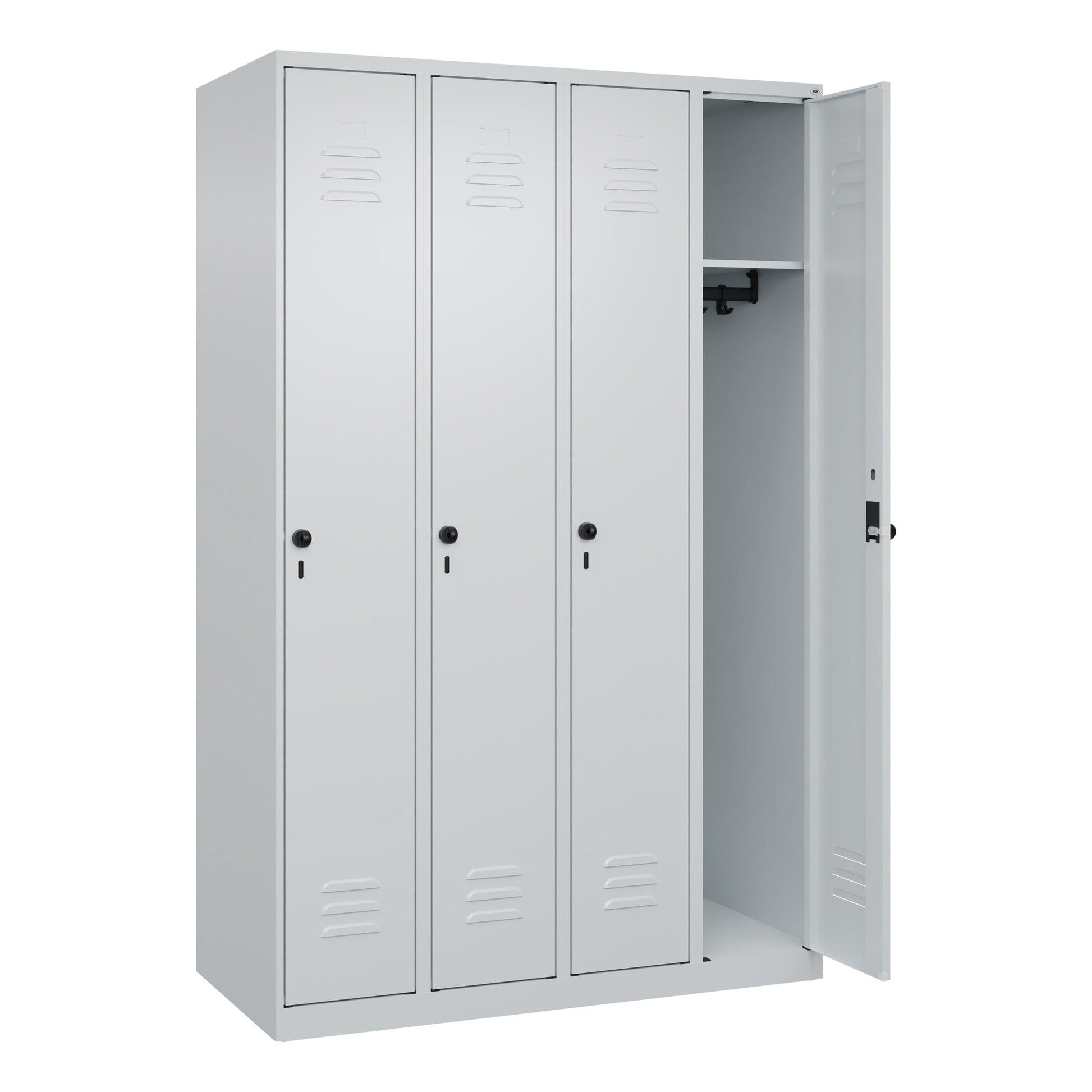Bezeichnung: C+P Kleiderspind Classic PLUS 1.200 x 1.850 x 500 mm (B x H x T) 4 Abteile Stahl Farbe der Front: lichtgrau Farbe des Korpus: lichtgrau