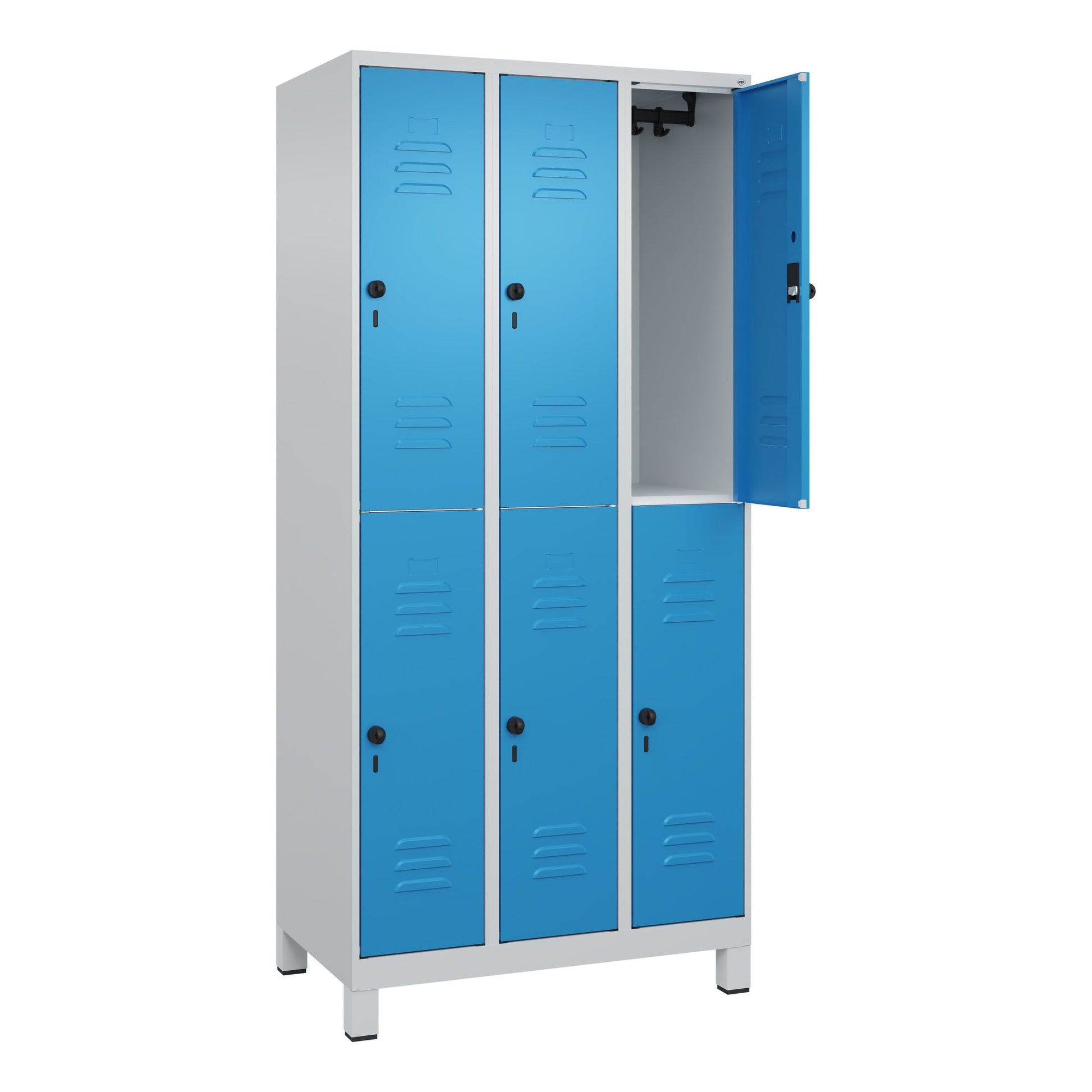 Bezeichnung: C+P Kleiderspind Classic PLUS 900 x 1.950 x 500 mm (B x H x T) 3 Abteile Stahl Farbe der Front: lichtblau Farbe des Korpus: lichtgrau