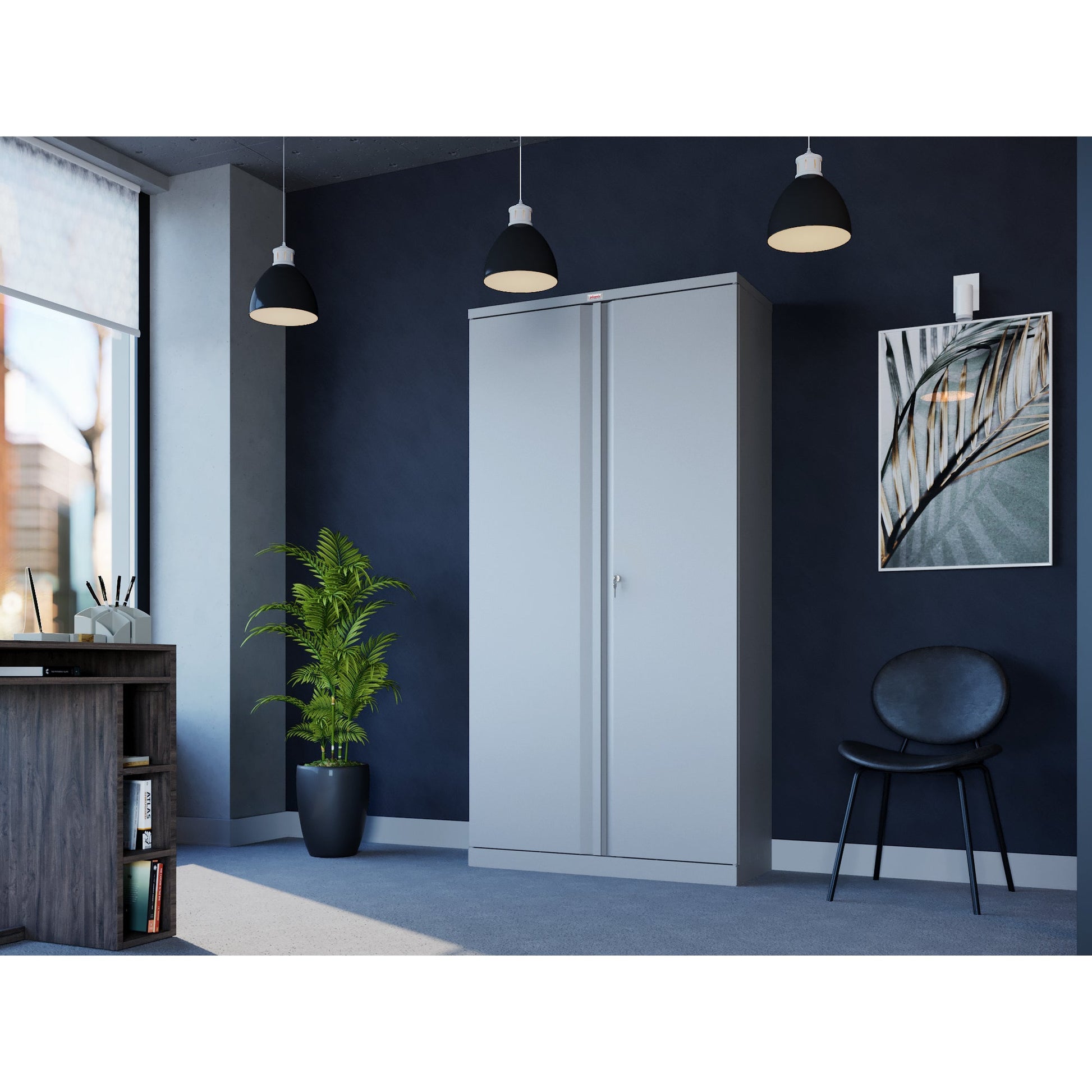 Bezeichnung: Phoenix Flügeltürenschrank 915 x 1.830 x 370 mm (B x H x T) 4 Fachböden Stahl, pulverbeschichtet Farbe der Front: grau Farbe des Korpus: grau