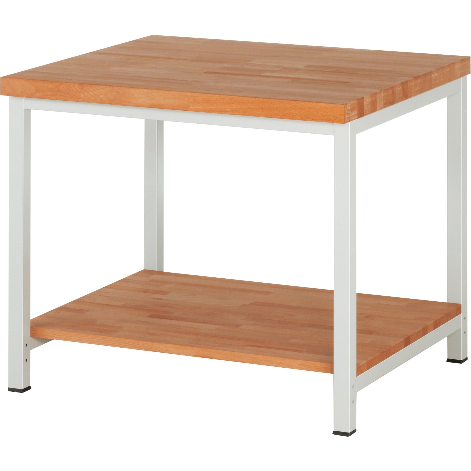 bucheBuchen-Riegel mit Keilzinken-Verleimung. Vorderkante mit Radius, andere Kanten gefast. Oberflächenschutz durch umweltfreundliches Lackleinöl. Der Klassiker unter den Arbeitsplatten: belastbar, druckfest, langlebig, natürlich, robust, schön, verschleißfest, wiederverwendbar. 100 % aus eigener Produktion (vom Baum bis zur Arbeitsplatte), mit dem Rohstoff aus nachhaltiger und regionaler Forstwirtschaft. Schweißgestell aus Profil-Stahlrohr (45 x 45 x 2 mm) inkl. Tiefenverstrebungen (oben und unten). Gestellfüße unten mit integrierter Höhenverstellung/Höheneinstellung mittels Profil-Stahlrohr (40 x 40 x 2 mm) mit Lochraster (20 mm) sowie Abschlusselement inkl. Niveauausgleich und Anti-Rutsch-Noppe für sicheren Stand. Querstreben aus C-Profil (40 x 40 x 2 mm) oben unter der Arbeitsplatte (vorne, hinten) sowie unten (mittig unter dem Ablageboden). Die Gestellfüße sind vorbereitet für die Aufnahme/Nachrüstung eines Rollensatzes. Ablageboden unten aus massiver Buche, Stärke 25 mm, Fachhöhe 595 mm.