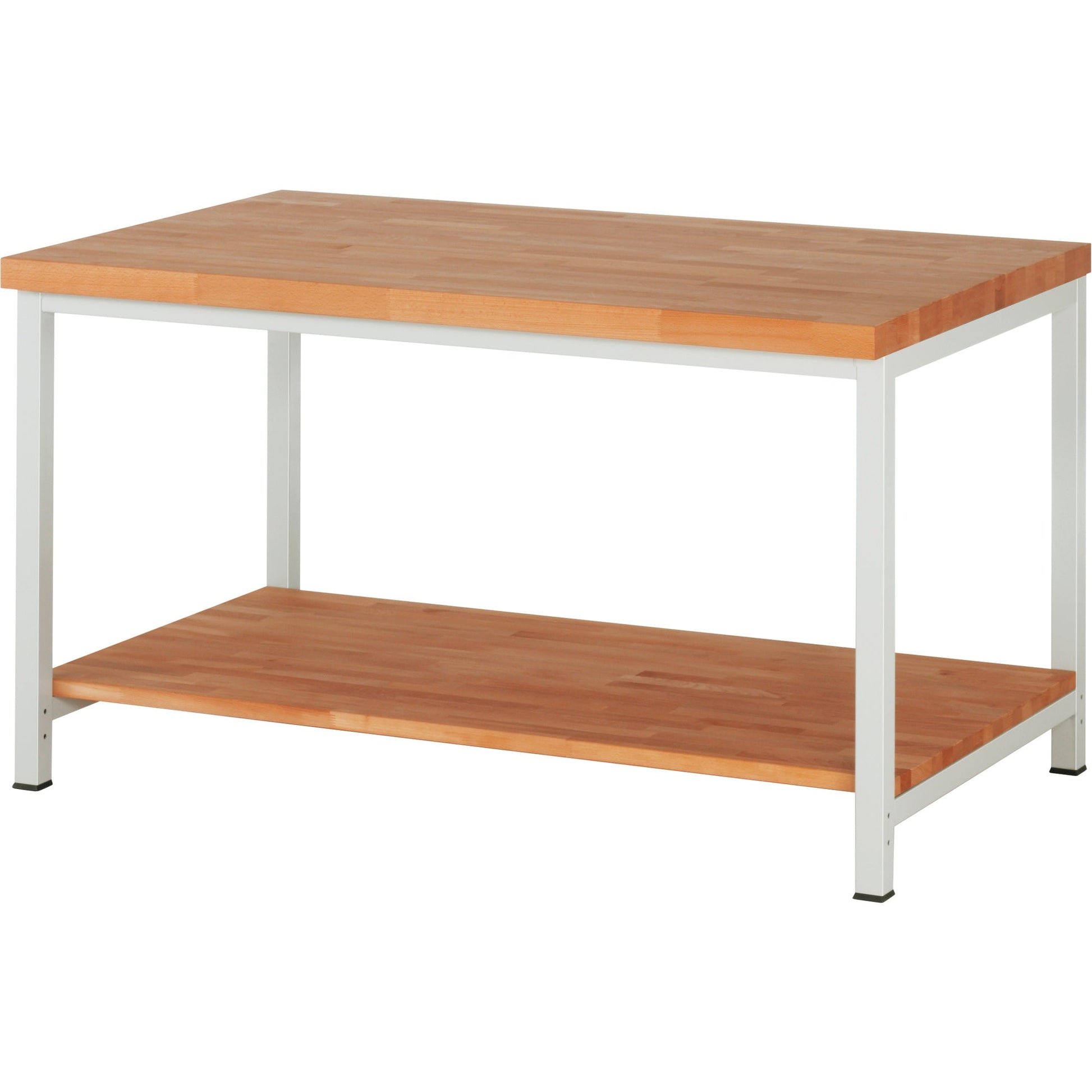 bucheBuchen-Riegel mit Keilzinken-Verleimung. Vorderkante mit Radius, andere Kanten gefast. Oberflächenschutz durch umweltfreundliches Lackleinöl. Der Klassiker unter den Arbeitsplatten: belastbar, druckfest, langlebig, natürlich, robust, schön, verschleißfest, wiederverwendbar. 100 % aus eigener Produktion (vom Baum bis zur Arbeitsplatte), mit dem Rohstoff aus nachhaltiger und regionaler Forstwirtschaft. Schweißgestell aus Profil-Stahlrohr (45 x 45 x 2 mm) inkl. Tiefenverstrebungen (oben und unten). Gestellfüße unten mit integrierter Höhenverstellung/Höheneinstellung mittels Profil-Stahlrohr (40 x 40 x 2 mm) mit Lochraster (20 mm) sowie Abschlusselement inkl. Niveauausgleich und Anti-Rutsch-Noppe für sicheren Stand. Querstreben aus C-Profil (40 x 40 x 2 mm) oben unter der Arbeitsplatte (vorne, hinten) sowie unten (mittig unter dem Ablageboden). Die Gestellfüße sind vorbereitet für die Aufnahme/Nachrüstung eines Rollensatzes. Ablageboden unten aus massiver Buche, Stärke 25 mm, Fachhöhe 595 mm.