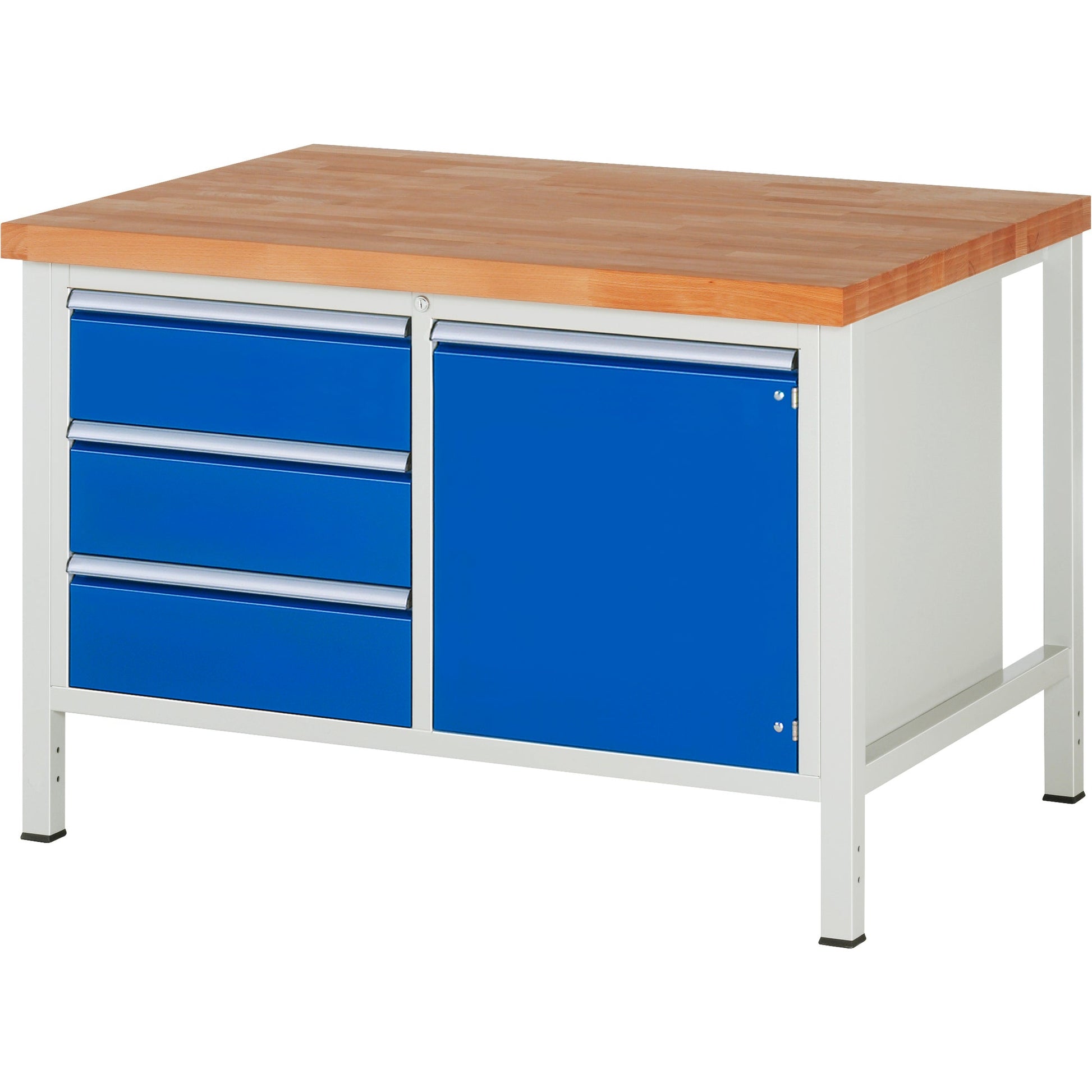 lichtgrauBuchen-Riegel mit Keilzinken-Verleimung. Vorderkante mit Radius, andere Kanten gefast. Oberflächenschutz durch umweltfreundliches Lackleinöl. Der Klassiker unter den Arbeitsplatten: belastbar, druckfest, langlebig, natürlich, robust, schön, verschleißfest, wiederverwendbar. 100 % aus eigener Produktion (vom Baum bis zur Arbeitsplatte), mit dem Rohstoff aus nachhaltiger und regionaler Forstwirtschaft. Schweißgestell mit Gestellfußpaaren aus Profil-Stahlrohr (45 x 45 x 2 mm) inkl. Tiefenverstrebungen (oben und unten). Gestellfüße unten mit integrierter Höhenverstellung/Höheneinstellung mittels Profil-Stahlrohr (40 x 40 x 2 mm) mit Lochraster (20 mm) sowie Abschlusselement inkl. Niveauausgleich und Anti-Rutsch-Noppe für sicheren Stand. Die Gestellfüße sind vorbereitet für die Aufnahme/Nachrüstung eines Rollensatzes. Unterbau-Container, 1.145 x 620 x 650 mm (B x H x T). Schublade-Größe-L, Innenmaß 490 x 560 mm (B x T). Die Nutzhöhe der Schublade entspricht der Fronthöhe abzgl. 15 mm. Rollengelagerte Teilauszugsschienen (Auszug 90 %) mit Selbsteinlauf und Rücklaufsicherung. Flügeltür mit selbst zuziehenden Federscharnieren, dahinter jeweils 1 Fachboden. Durchgehende Griffleiste ErgoScript®: Stahlblechbasis mit alufarbenem Overlay und integrierter Klarsichtabdeckung.