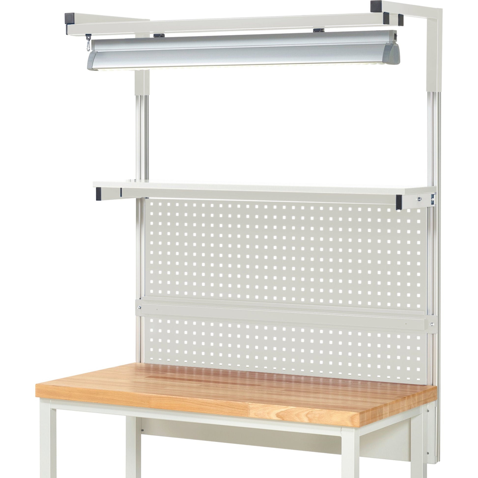 lichtgrauSet bestehend aus: 1 Befestigungssatz (Querträger) mit 2 System-Stützen, 1 Lochplatte (650 mm hoch) mit 4-Kant Systemlochung (Lochung 10 x 10 mm, Abstand Lochmitte-Lochmitte 38 mm) zur Aufnahme von Lochplatten-Zubehör. 1 Etagenbord, melaminbeschichtet (300 mm tief). 1 Halteschiene für Aufnahme von Sichtlagerkästen (offene Einhängekante an der Rückseite der Sichtlagerkästen erforderlich). 1 Auslegerpaar (550 x 300 mm T x H) für Aufnahme von Laufschiene/Montageschiene. 2 Laufschiene/Montageschiene für Aufnahme von Beleuchtungsleiste und/oder Laufwagen mit Karabiner. 1 Laufwagen mit Karabiner für Aufnahme von Federzug, Balancer. 1 LED-Arbeitsplatzleuchte: Langfeldleuchte (Leuchtengehäuse aus Aluminium). Integrierter elektronischer LED-Konverter. Ein-/Aus-Schalter, Anschlusskabel mit Stecker. Einbauhöhe der Anbauelemente innerhalb der System-Stützen verstellbar. Der Befestigungssatz (Querträger) wird hinten unter der Arbeitsplatte an den Systemunterbau angebracht. Die 2 System-Stützen (Aluminiumprofil 40 x 40 mm) werden mittels Nutensteinen an den Befestigungssatz (Querträger) angeschraubt (Höhe einstellbar) und laufen hinter der Arbeitsplatte nach oben, so dass die gesamte Tiefe der Arbeitsplatte frei bleibt (kein Verschrauben auf der Arbeitsplatte). Die System-Stützen verfügen an allen 4 Seiten über eine Profilnut, so dass eine allseitige Nutzung möglich ist. Die 2 System-Stützen werden links und rechts außen angeschraubt, so dass 1 Systemfeld entsteht. Dieses Produkt enthält eine austauschbare Lichtquelle der Energieeffizienzklasse D. Die Lichtquelle ist nur vom Fachmann austauschbar.