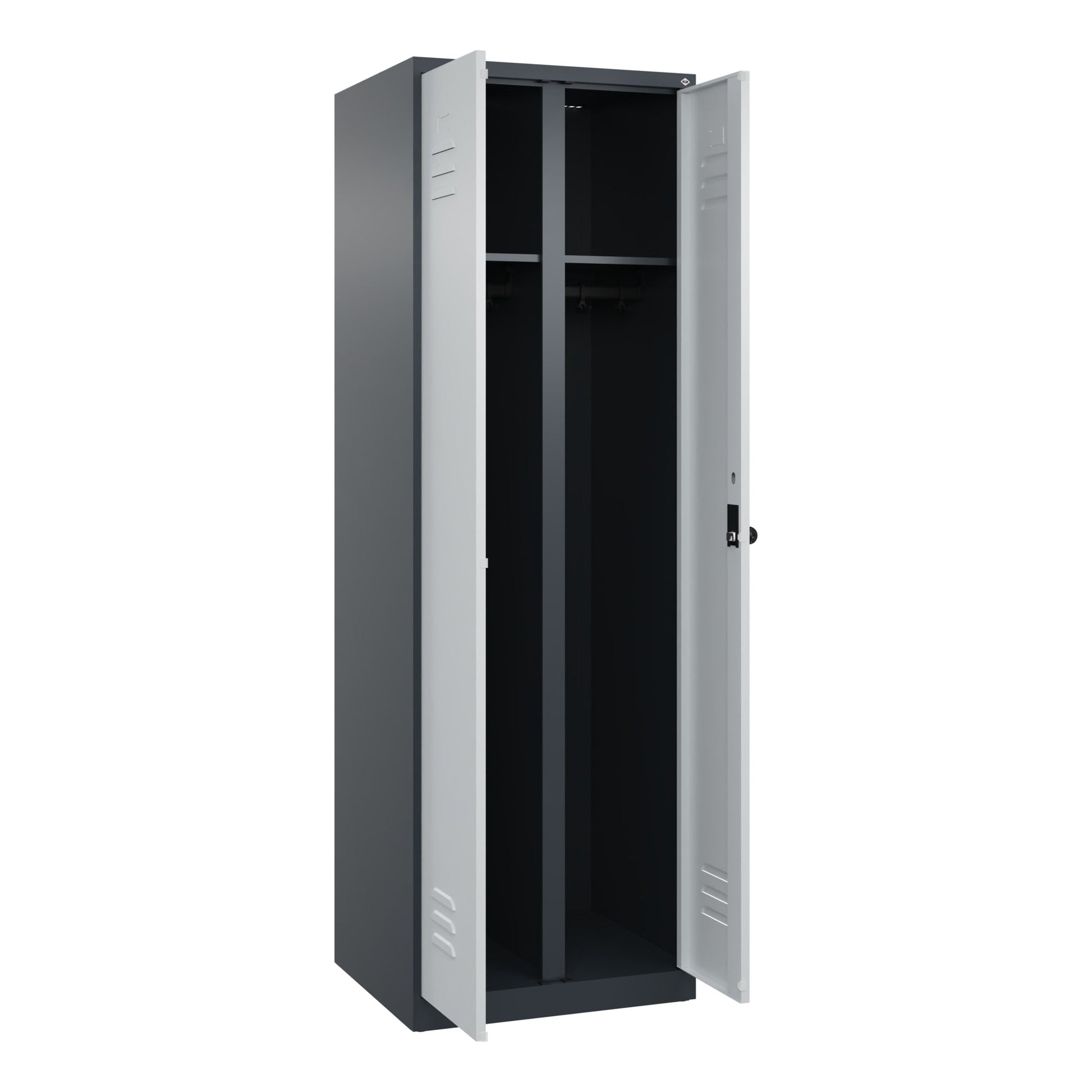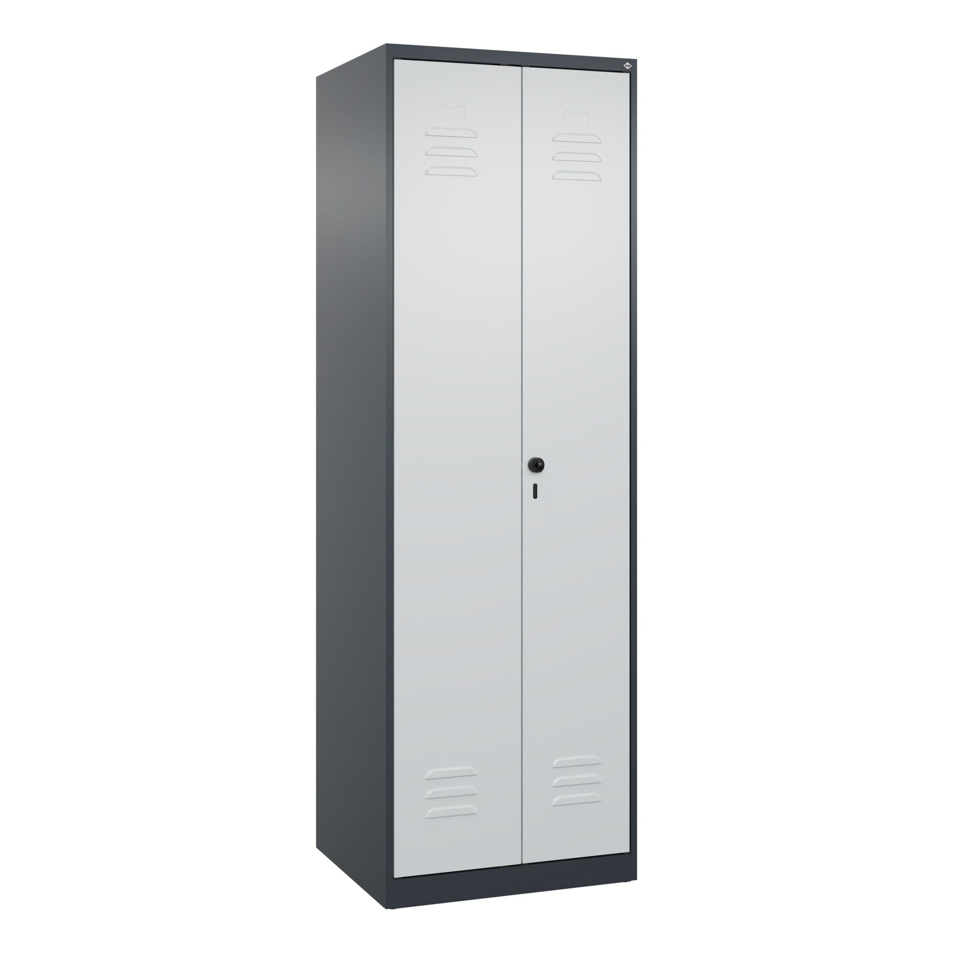 Bezeichnung: C+P Kleiderspind Classic PLUS 600 x 1.850 x 500 mm (B x H x T) 2 Abteile Stahl Farbe der Front: anthrazitgrau Farbe des Korpus: lichtgrau