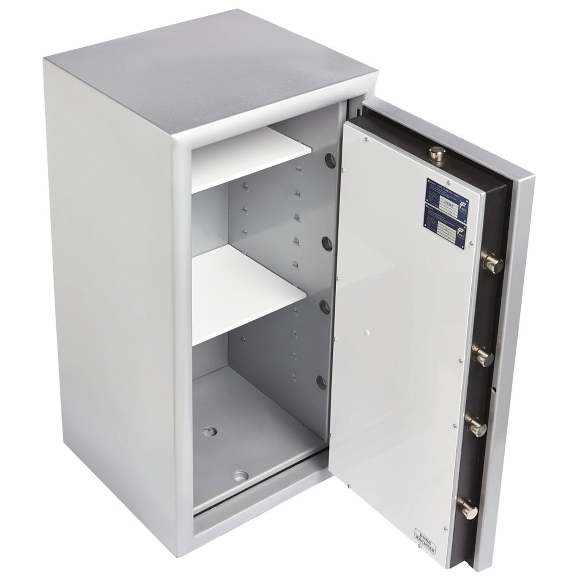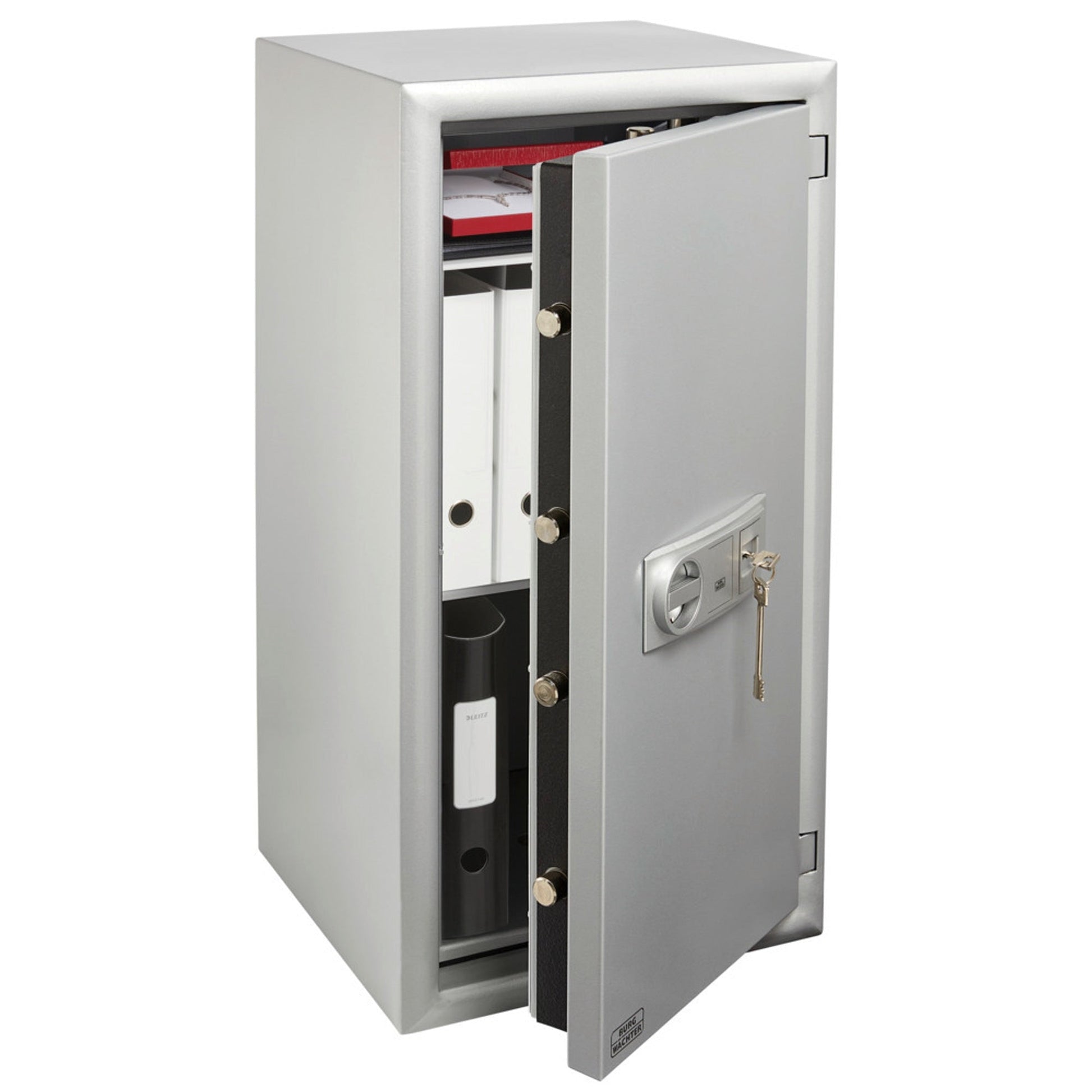 grauZertifizierter Schutz gegen Diebstahl vereint mit zertifiziertem Schutz gegen Feuer und Hitze: Der Tresor Diplomat MTD 780 K bietet Widerstandsgrad I und einen Feuerschutz von mindestens 60 Minuten für Papier. Damit ist der Wertschutzschrank optimal für die private und gewerbliche Nutzung geeignet. Der Diplomat-Tresor ist vierseitig verriegelt und mit einem dreiwandigen Korpus ausgestattet, die Tür ist sogar vierwandig konstruiert. Diese massive Bauweise sorgt für einen extrem hohen Schutz! Darüber hinaus schützt eine spezielle Armierung (Stützmaterial in den Wänden) Riegel wie Bolzen. Ein weiteres Plus beim Diplomat MTD 780 K sind die Notverriegelungen mit zwei nicht rücksetzbaren, unabhängigen Systemen. Ein komfortables Extra bietet das Hochsicherheits-Doppelbartschloss "SecuSafe”: Denn sollte einmal ein Schlüssel verloren gehen, kann mit einem neuen Schlüssel-Set das Schloss auf eine neue Schließung umgestellt werden. Das ist günstiger uns sicherer, als einen Schlüssel nachzumachen.