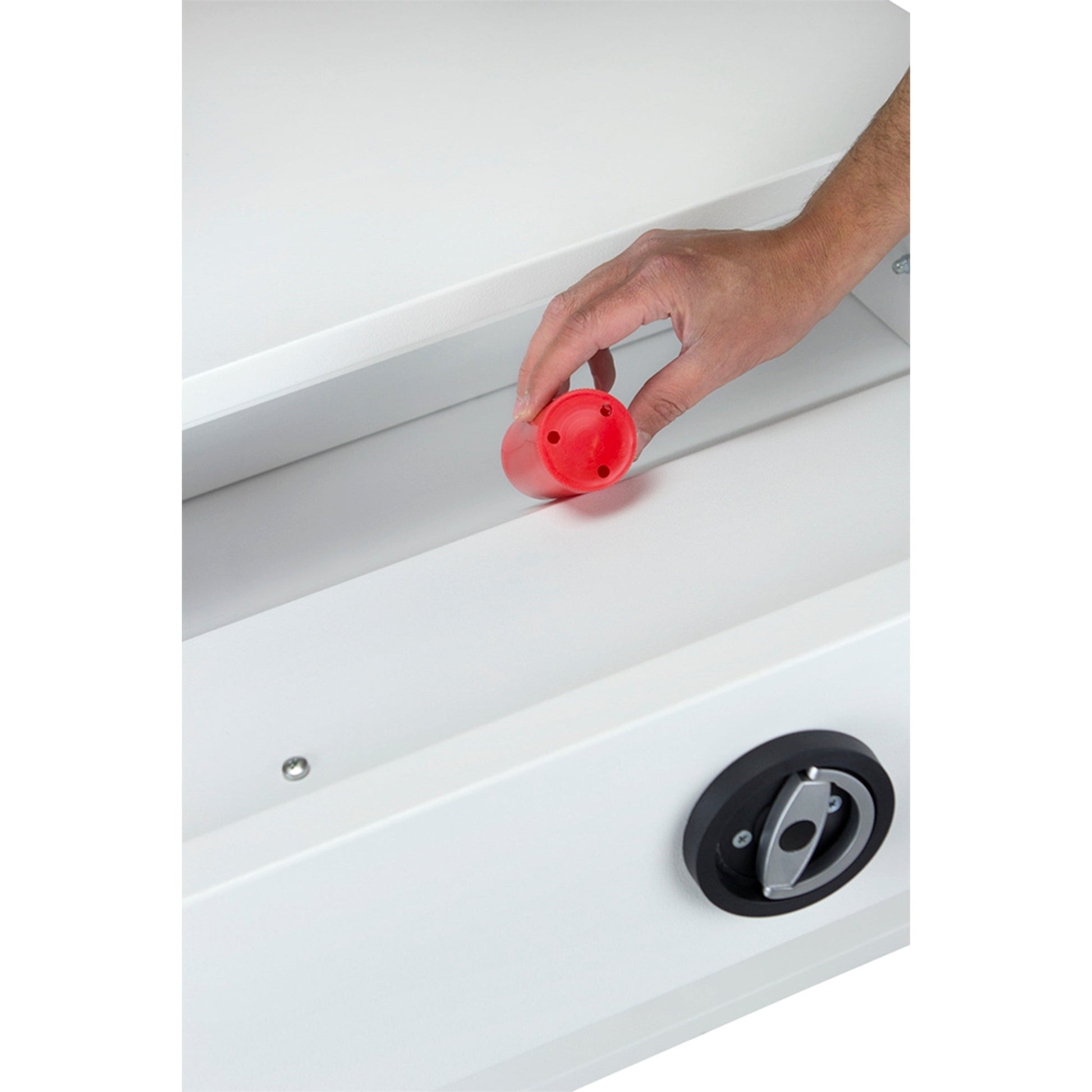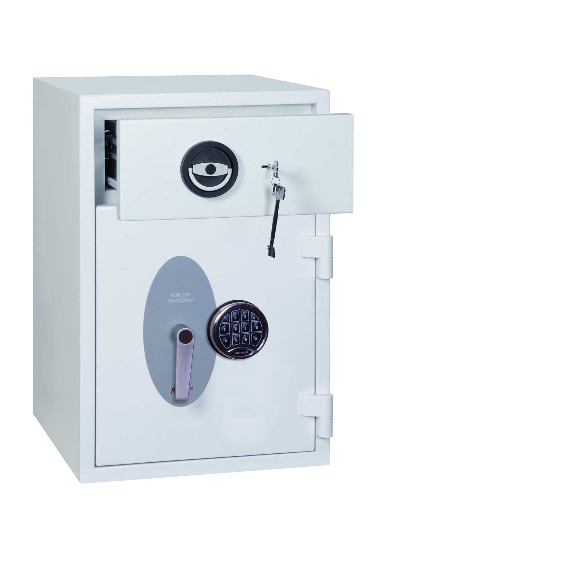 weißDie Phoenix Diamond Deposit-Serie ist für die sichere Aufbewahrung großer Bargeldmengen konzipiert, ohne die übliche Verringerung des Sicherheitsschutzes, der normalerweise mit Einzahlungssafes verbunden ist. Ideal für Einzelhandelsgeschäfte, Garagenvorplätze, Banken und Finanzinstitute. SICHERHEITSSCHUTZ - Getestet nach dem renommierten europäischen Sicherheitsstandard EN1143-2:2014, Klasse D1 (ECB.S-zertifiziert) mit einer Deckung von 10.000 € für Bargeld oder 100.000 € für Wertsachen. ZULASSUNGEN - Von der britischen Polizei zugelassen (Secured by Design-Schema) und von der Association of Insurance Surveyors (AiS). SICHERE TÜRVERRIEGELUNG - Ausgestattet mit einem elektronischen Hochsicherheitsschloss der VdS-Klasse II. SCHUBLADENAUFBEWAHRUNG - Hochsichere ausziehbare Schubladenaufbewahrung mit speziellem Schallwand-Fallsystem für maximale Sicherheit. Das Schubladendepot ist durch Mehrfachsperrbolzen gesichert und mit einem Hochsicherheitsschloss der VdS-Klasse I verschlossen. KONSTRUKTION - Doppelwandige Verbundkonstruktion, Anti-Bohrplatten und Schließfachschutz für die Tür bieten einen Tresor von großer Stärke. BEFESTIGUNG - Fertig vorbereitet für Bodenbefestigung. FARBE - Beendet in einer hochwertigen, kratzfesten Farbe. Geeignet für die Aufbewahrung von kontrollierten Arzneimitteln, deren Wirkstoffe 500 Gramm überschreiten.