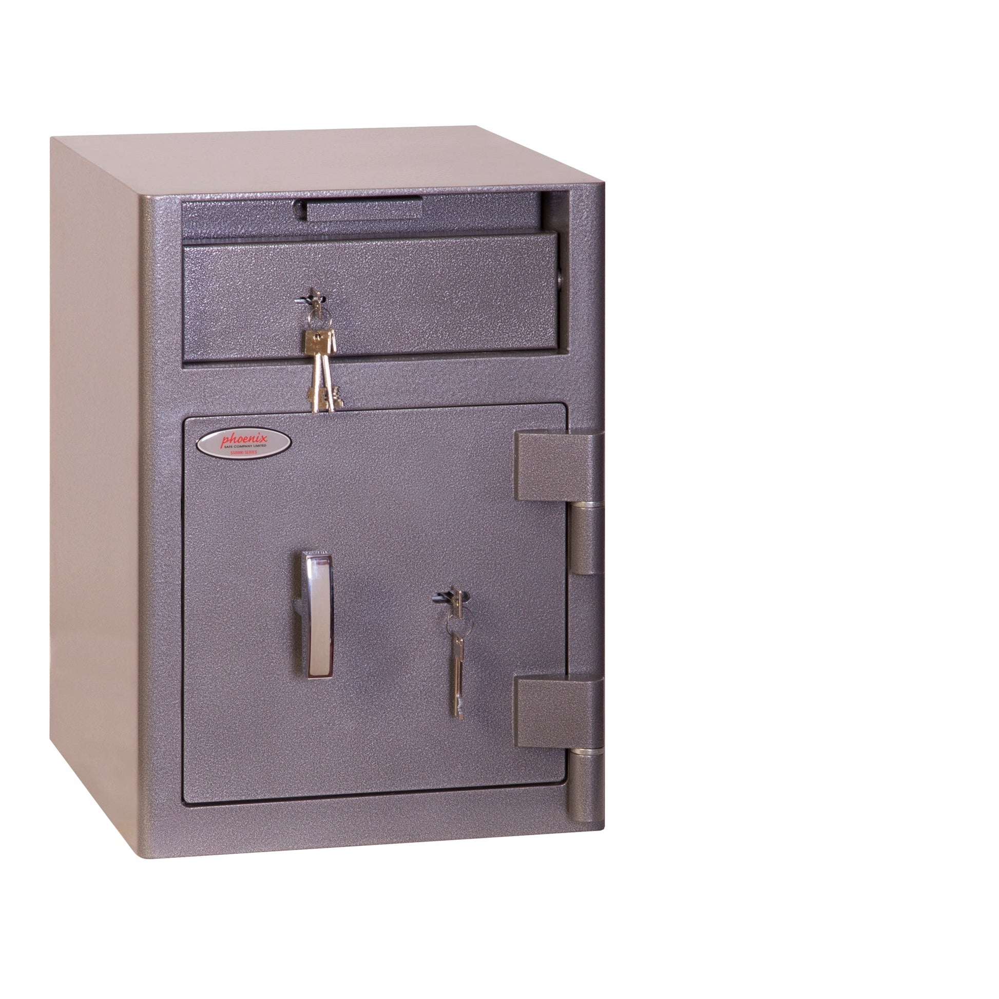 graphitgrauDer Phoenix Cash Deposit SS0996KD ist ein Frontlader-Sicherheits- und Einzahlungssafe für die 24-Stunden-Bargeldverwaltung. SICHERHEITSSCHUTZ - Empfohlen für eine Bargelddeckung über Nacht von 3.000 € Bargeld oder 30.000 € Wertsachen. VERSCHLUSS - Ausgestattet mit einem Hochsicherheitsschloss der VDS-Klasse I. DEPOT-EINRICHTUNG - 100 H x 415 B x 220 T - Ausgestattet mit einer speziellen Phoenix-Prallplatte, um sicherzustellen, dass der Inhalt nicht herausgefischt werden kann. Verfügt auch über eine Nachtverriegelungsplatte für erhöhte Sicherheit außerhalb der Geschäftszeiten. BEFESTIGUNG - Fertig vorbereitet für die Bodenbefestigung. FARBE - Beendet in einer hochwertigen, kratzfesten Farbe.