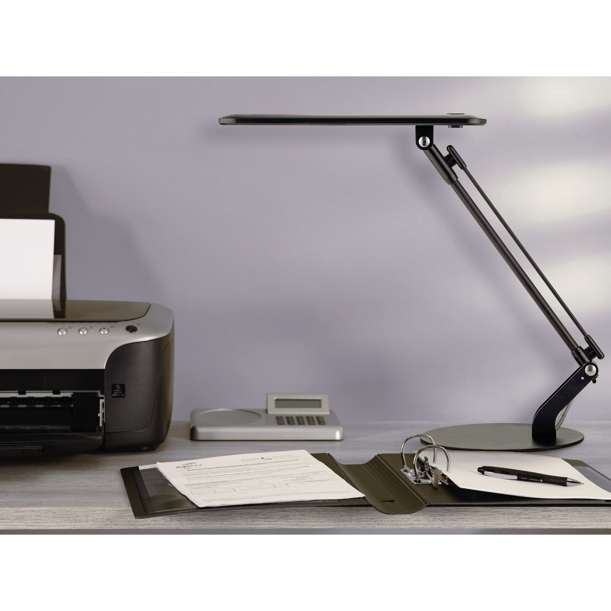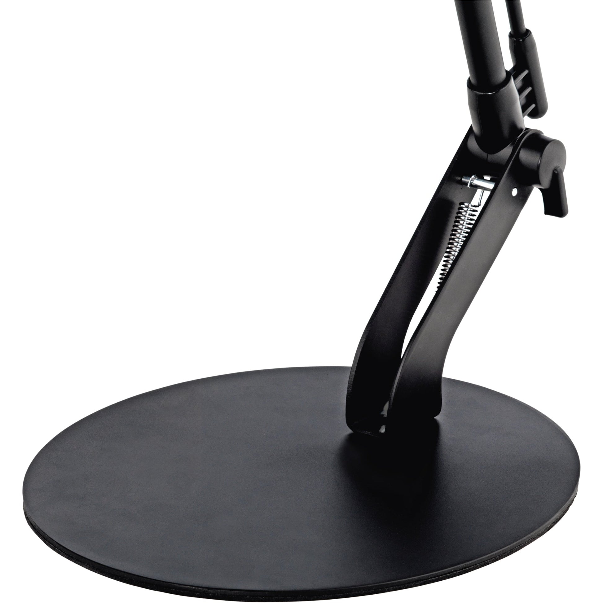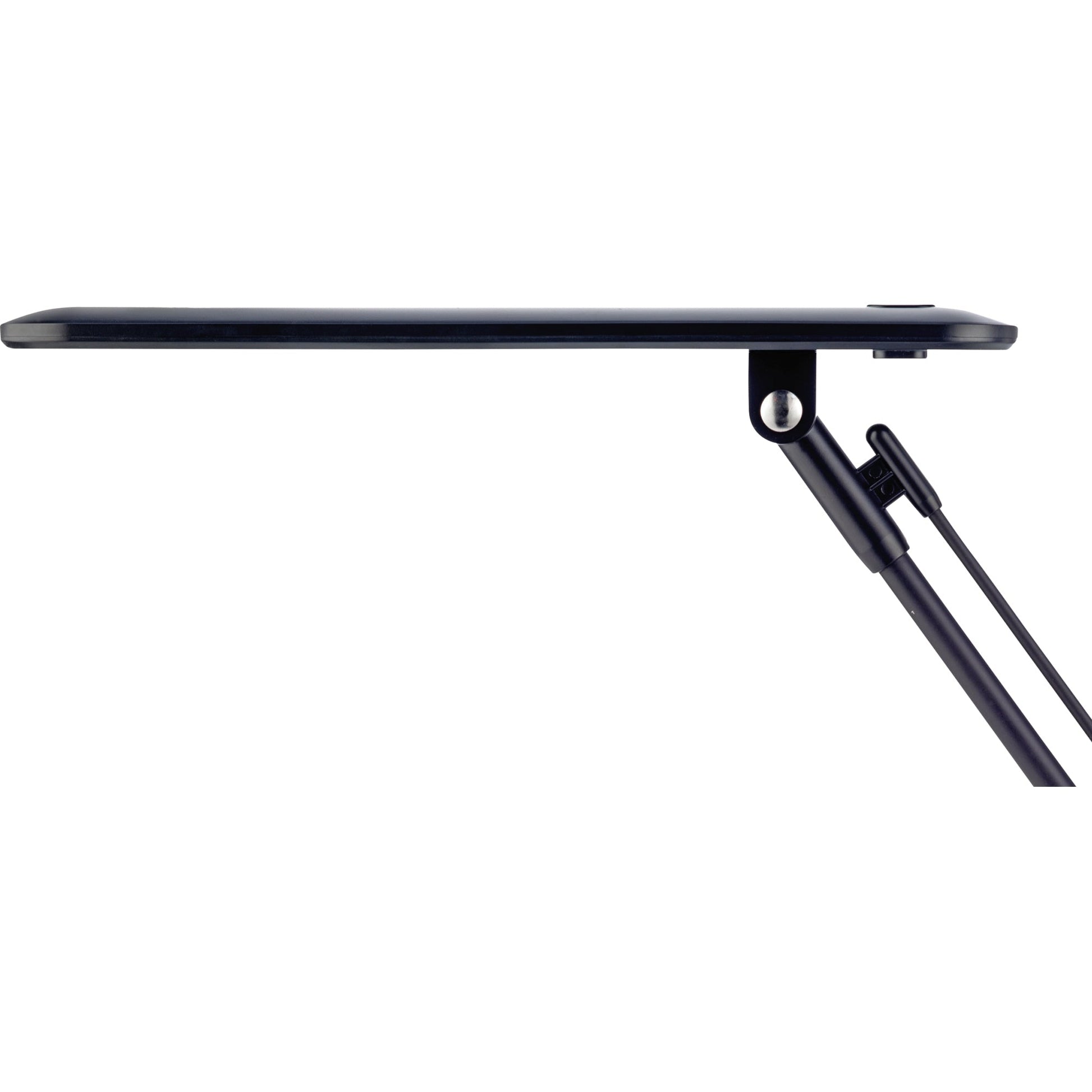 schwarzer langgezogene Lampenkopf der Leuchte RUMBA sorgt für gute Lichtstreuung auf der Arbeitsfläche. Der Schalter auf dem Leuchtenkopf ist zum Ein- und Ausschalten leicht zu erreichen. Das eingebaute LED-Modul ist effizient und langlebig. Kompakt und klar designt fügt sich RUMBALED in jede Arbeitsumgebung ein. Dank der Gelenke an Arm und Kopf lässt sich das Licht gut ausrichten. Der schwere flache Sockel gibt RUMBALED einen guten Stand. Dieses Produkt enthält eine Lichtquelle der Energieeffizienzklasse F und diese kann nicht ausgetauscht werden.
