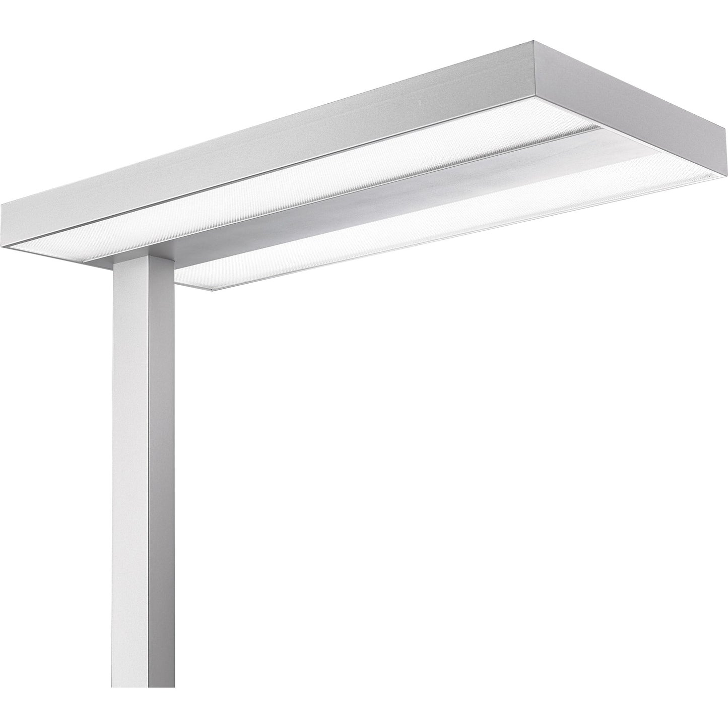 aluminium/silberStehleuchte für das moderne Büro oder Arbeitszimmer. Mit dieser hochwertigen Leuchte kann eine ideale Lichtsituation am Schreibtischarbeitsplatz erreicht werden. Eine vollprismatische Abdeckung sorgt für perfektes direktes Licht für den Bildschirmarbeitsplatz und durch eine zusätzlich indirekte Beleuchtung des Raumes nach oben erreicht man einen idealen doppelten Lichteffekt. Die Leuchte ist stufenlos dimmbar über einen Drehschalter am Leuchtenmast. Der U-förmige, flache Leuchtenfuß aus massivem Metall ermöglicht eine unauffällige Platzierung der Leuchte direkt am Schreibtisch. Dieses Produkt enthält eine Lichtquelle der Energieeffizienzklasse D und diese kann nicht ausgetauscht werden.