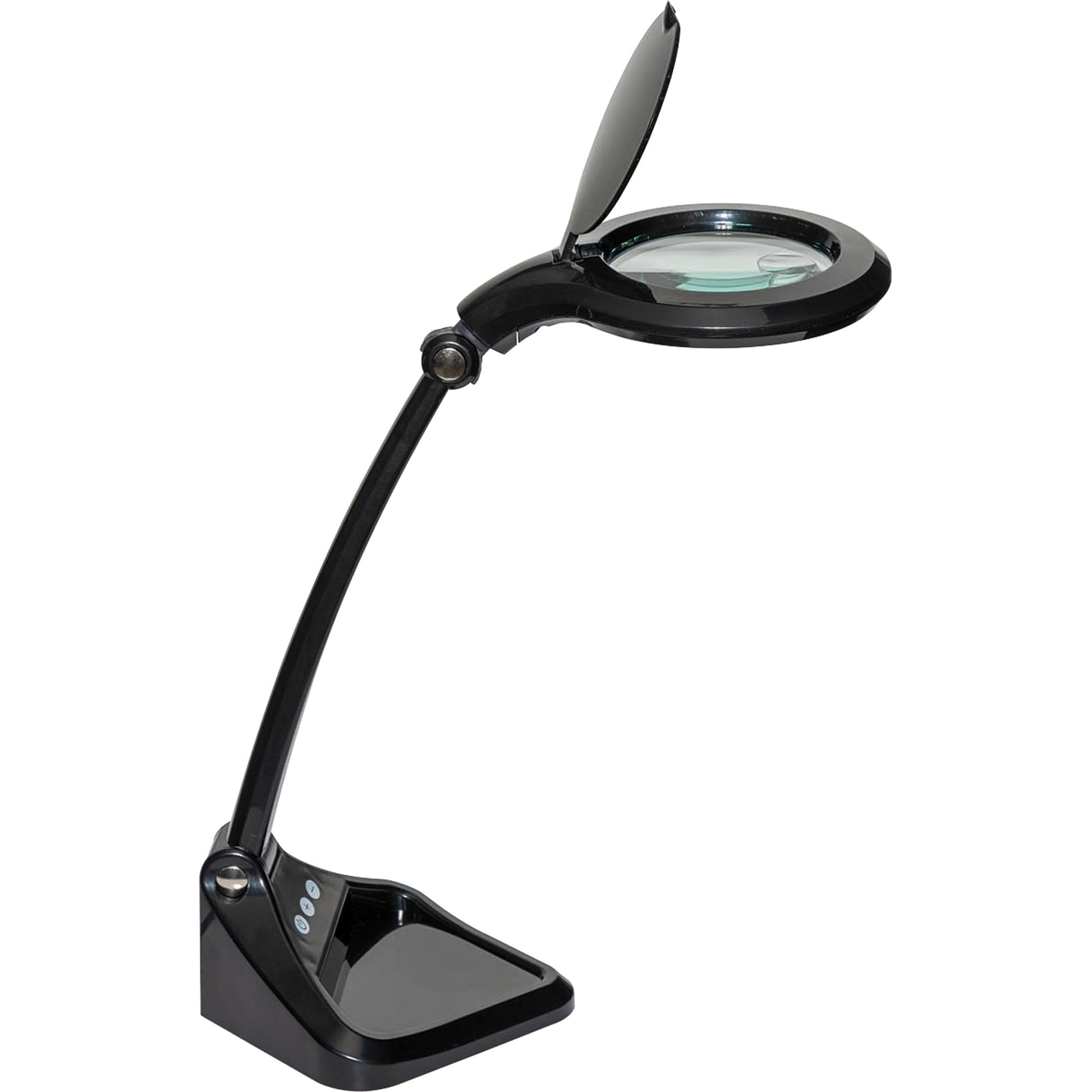 schwarzLupe und funktionelle Arbeitsplatzleuchte mit Ablage im Fuß für kleine Utensilien. Gleichmäßige Ausleuchtung durch ringförmig angeordnete LEDs. Ideal für Feinarbeit in Laboren, Werkstätten, technischen Büros, Arztpraxen. Oder im Privatbereich für Briefmarkensammler, Feinmechaniker oder als Leselupe. 3 Dioptrien-Linse (1,75-fache Vergrößerung), Ø: 10 cm (4") und zusätzlich eingebettete 12 Dioptrien Echtglas-Linse (Vergrößerung um 300 %), Ø : 2,5 cm (1"), Linsenfläche 78,5 cm². Leuchtenkopf nach oben/unten neigbar und zur Seite schwenkbar. Beschwerungseinlage und schreibtischschonende Unterlage. Schalter am Leuchtenfuß für bequemes Dimmen, An- und Ausschalten. Dieses Produkt enthält eine austauschbare Lichtquelle der Energieeffizienzklasse G.