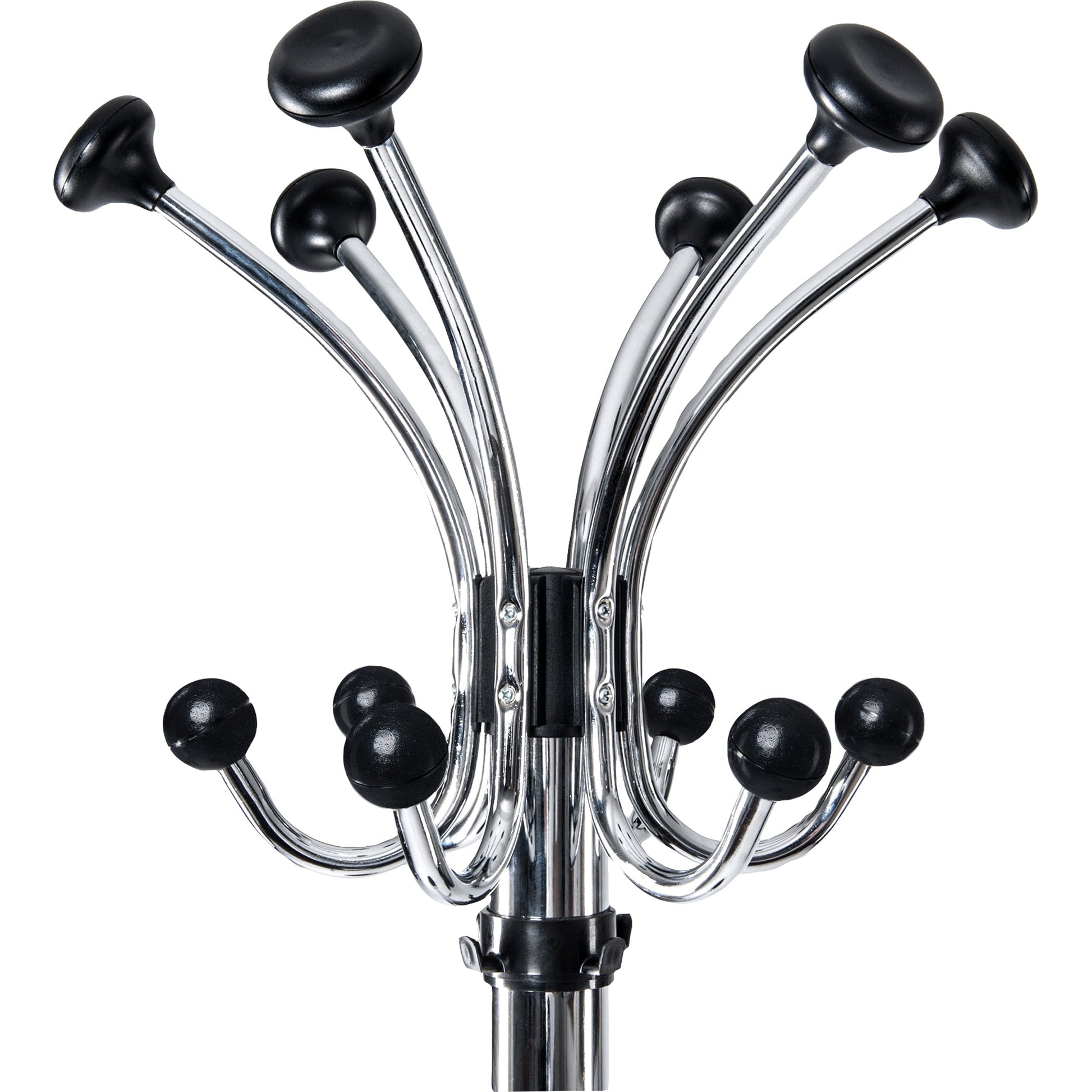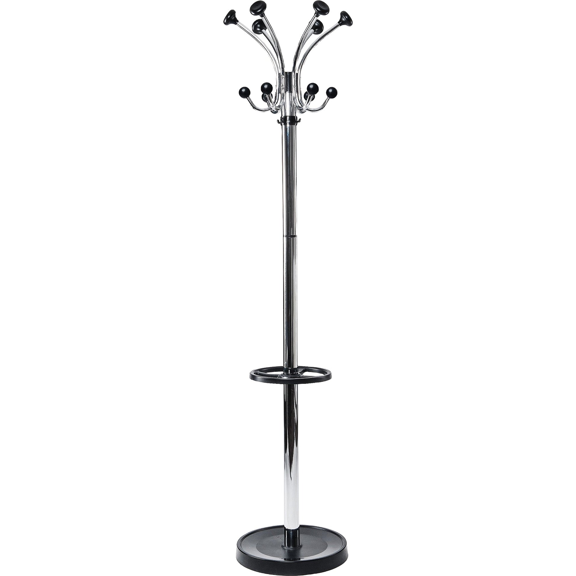hellsilberElegante Standgarderobe für starke Belastung. Verchromt: Säule und Haken hochglänzend. Schwerer Fuß mit Bodenschonern aus Filz, glänzend mit matt erodierter Fläche, kratzhemmend für Schirmspitzen. Abgerundete Kunststoffköpfe sitzen fest und wackeln nicht und schonen die Kleidung. 6 Huthaken Ø 5,5 cm, 6 Jackenhaken Ø 3,8 cm, je 4 zusätzliche Haken an der Säule und am Schirmständer. Drehbare Krone für bequemen Zugriff von allen Seiten. Schirmhalter, Ø 27 cm, für bis zu 8 Schirme und 4 Taschenschirme. Einfache Montage.