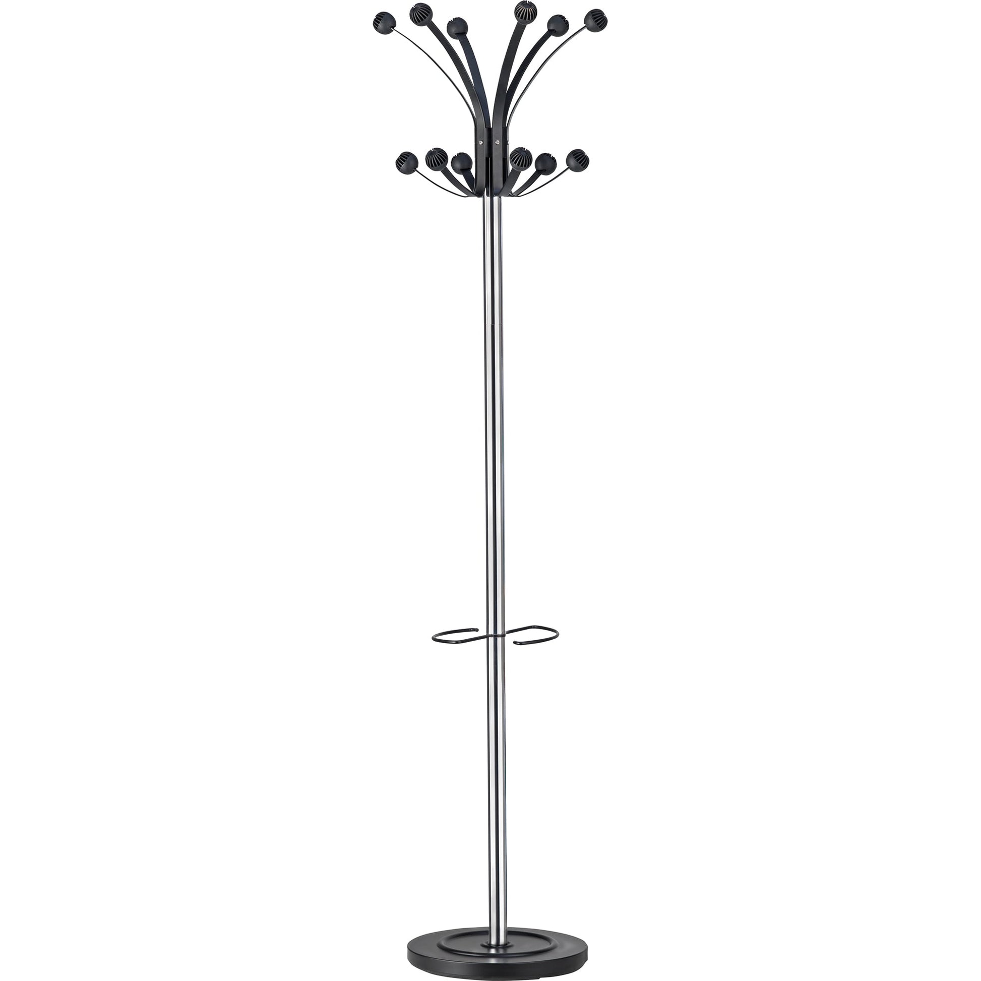 chrom/schwarzHAKEA verdankt sein hohes Aufnahmevermögen der großen Anzahl an Kleiderhaken. Dank des drehbaren Kopfes kann diese Garderobenlösung auch platzsparend in Ecken oder an einer Wand aufgestellt werden, ohne dass der Zugriff auf die Kleidungsstücke eingeschränkt wird. Er lässt sich schnell und einfach aufbauen. Das Design ist klassisch-elegant und eignet sich perfekt für Gemeinschaftsräume oder Großraumbüros. Die kugelförmigen Hakenkappen von HAKEA halten Kleidungsstücke sicher und schonend. Der verchromte Ständer betont das technisch-orientierte Design. Mit Schirmständer für 6 Schirme und Abtropfschale. Der ausgesprochen stabile Fuß ist mit Schutzschienen versehen, die bei jeder Last die Stabilität sicherstellen.