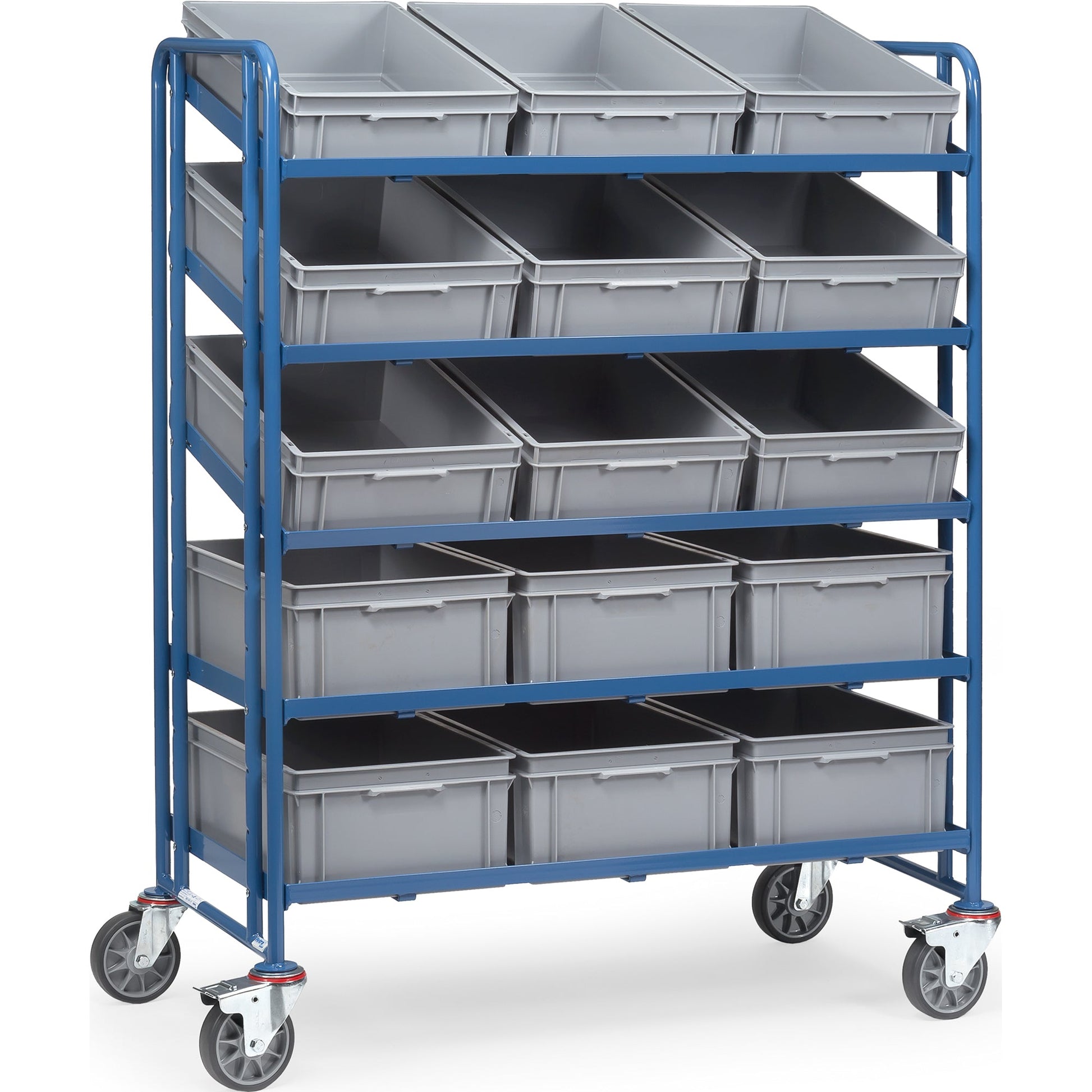 Bezeichnung: Fetra Etagenwagen 68,5 x 168,6 x 137,2 cm (B x H x L) 400kg 5 Böden inkl. 3 Eurokästen 40 x 14,5 x 60 cm (B x H x T), 6 Eurokästen 40 x 22 x 60 cm (B x H x T), 6 Eurokästen 40 x 17 x 60 cm (B x H x T)