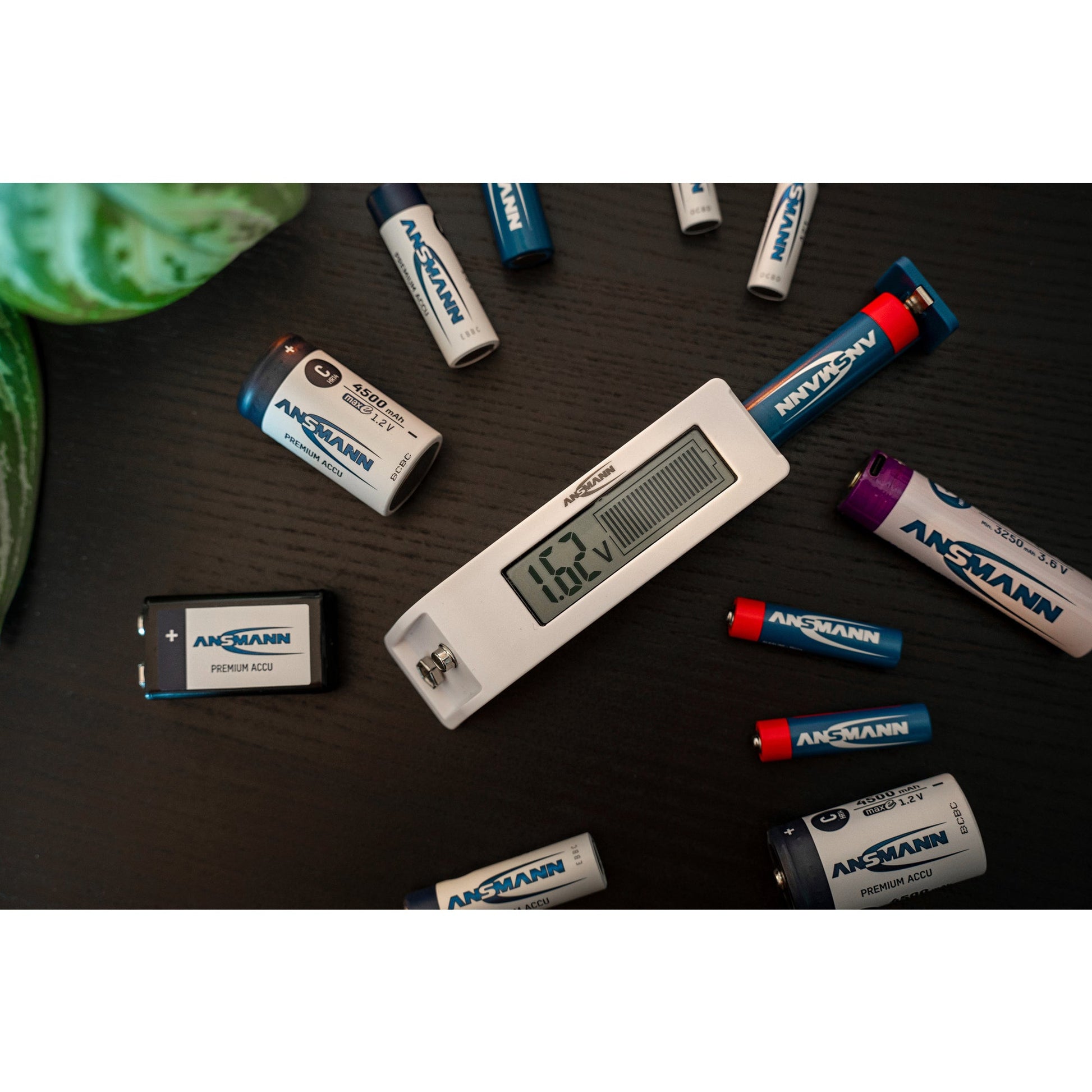 Bezeichnung: ANSMANN Batterietester Comfort Check AAAA/Mini, AAA/Micro, AA/Mignon, C/Baby, D/Mono, N/Lady, E/Block, 9V NiMH-Akkus, 3,6V/3,7V Li-Ion-Akkus, Knopfzellen, CR2, CR123A 11,1 x 3 x 2,7 cm (B x H x T)