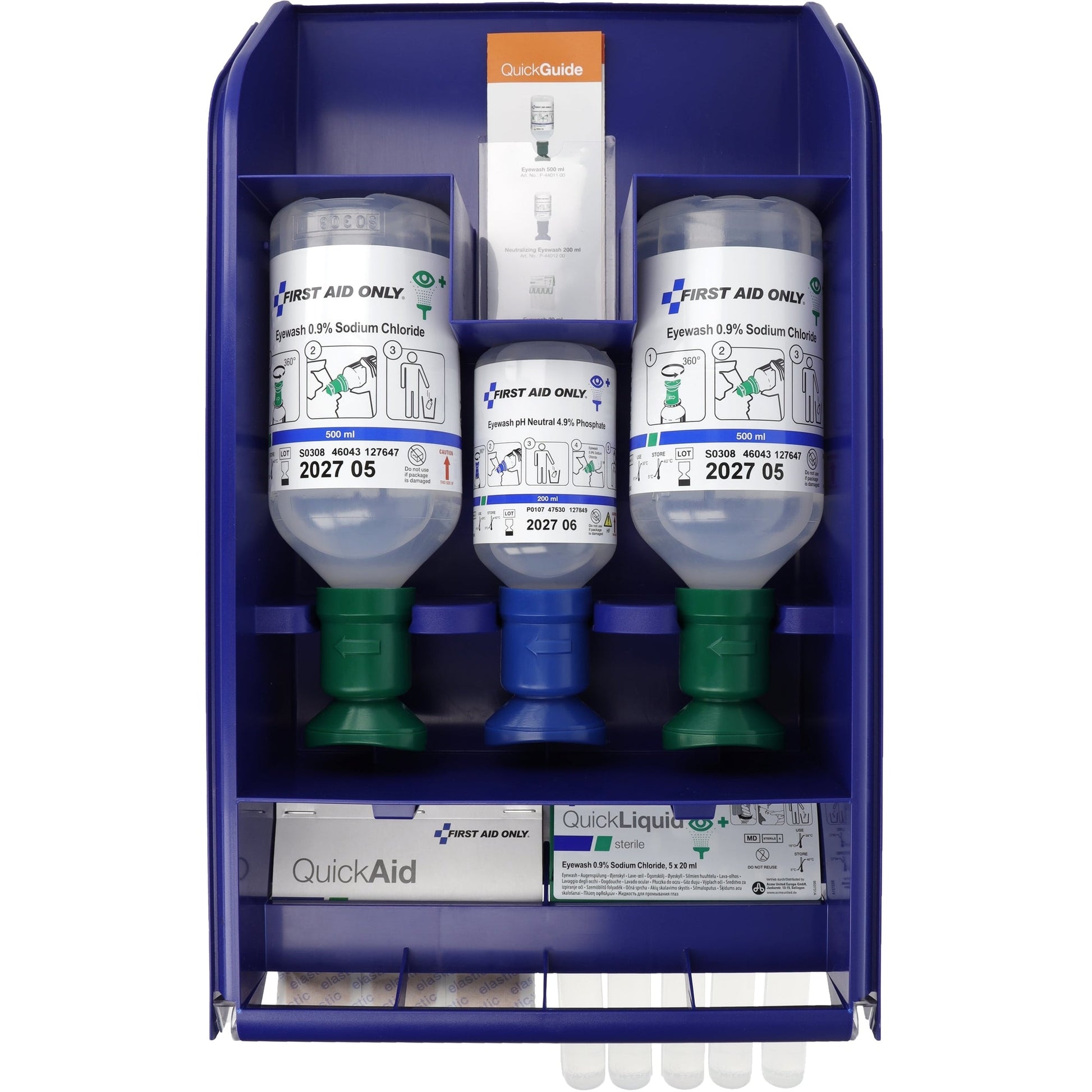 Bezeichnung: FIRST AID ONLY Augenspülstation QuickSafe Basic 2 x Augenspülflasche 500 ml Kochsalzlösung (0,9%), 1 x Augenspülflasche 200 ml Phosphatpufferlösung (4,9%), 5 x Augenspüllösung QuickLiquid 20 ml, 1 x QuickAid elastische Pflaster (45 Stück), 1x Broschüre