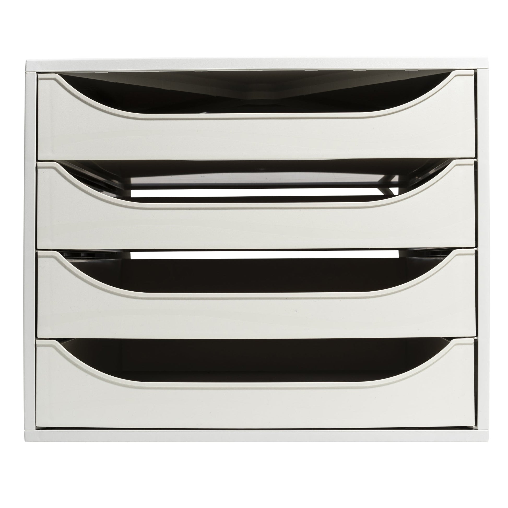 Bezeichnung: Soennecken Schubladenbox oeco 4 Schubladen DIN A4+ Kunststoff, 98 % recycelt Gehäusefarbe: lichtgrau Farbe der Schublade: lichtgrau